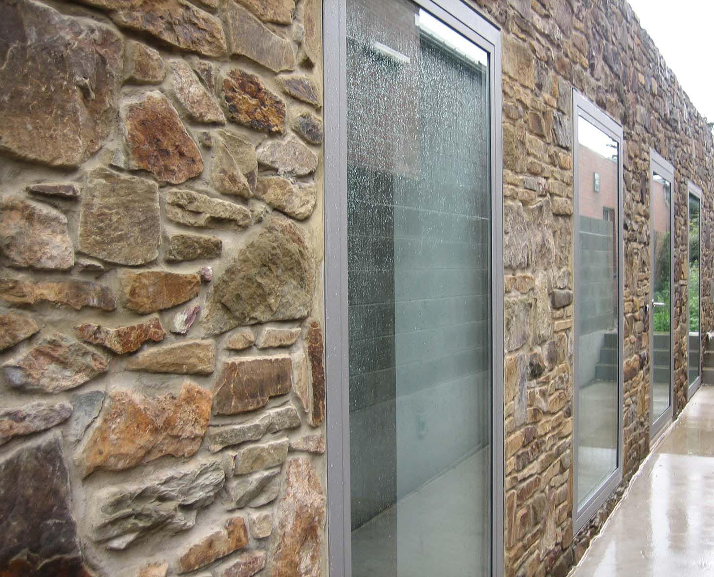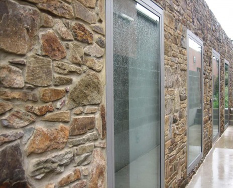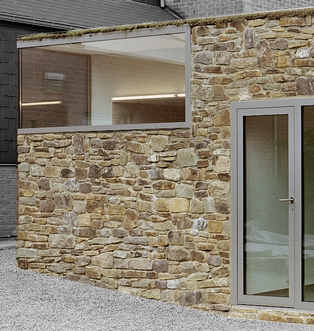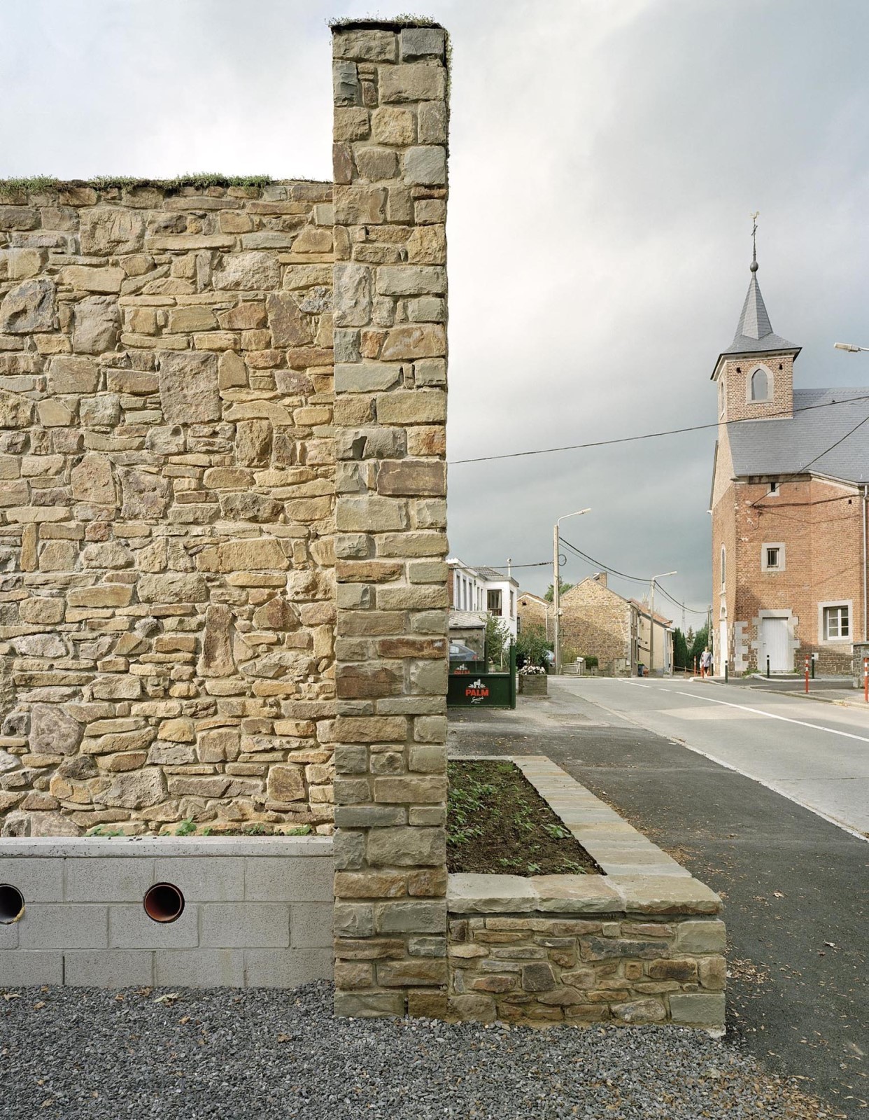 Pour répondre au diktat de l’administration locale qui ne souhaitait pas voir s’édifier une architecture contemporaine j’ai eu l’idée de construire un mur de clôture en pierres en lieu et place de celui qui existait, en béton préfabriqué. Ce mur génère derrière lui un bâtiment bas avec une « toiture-jardin » qui se couvrira de mousse. L’entrée se fait latéralement.