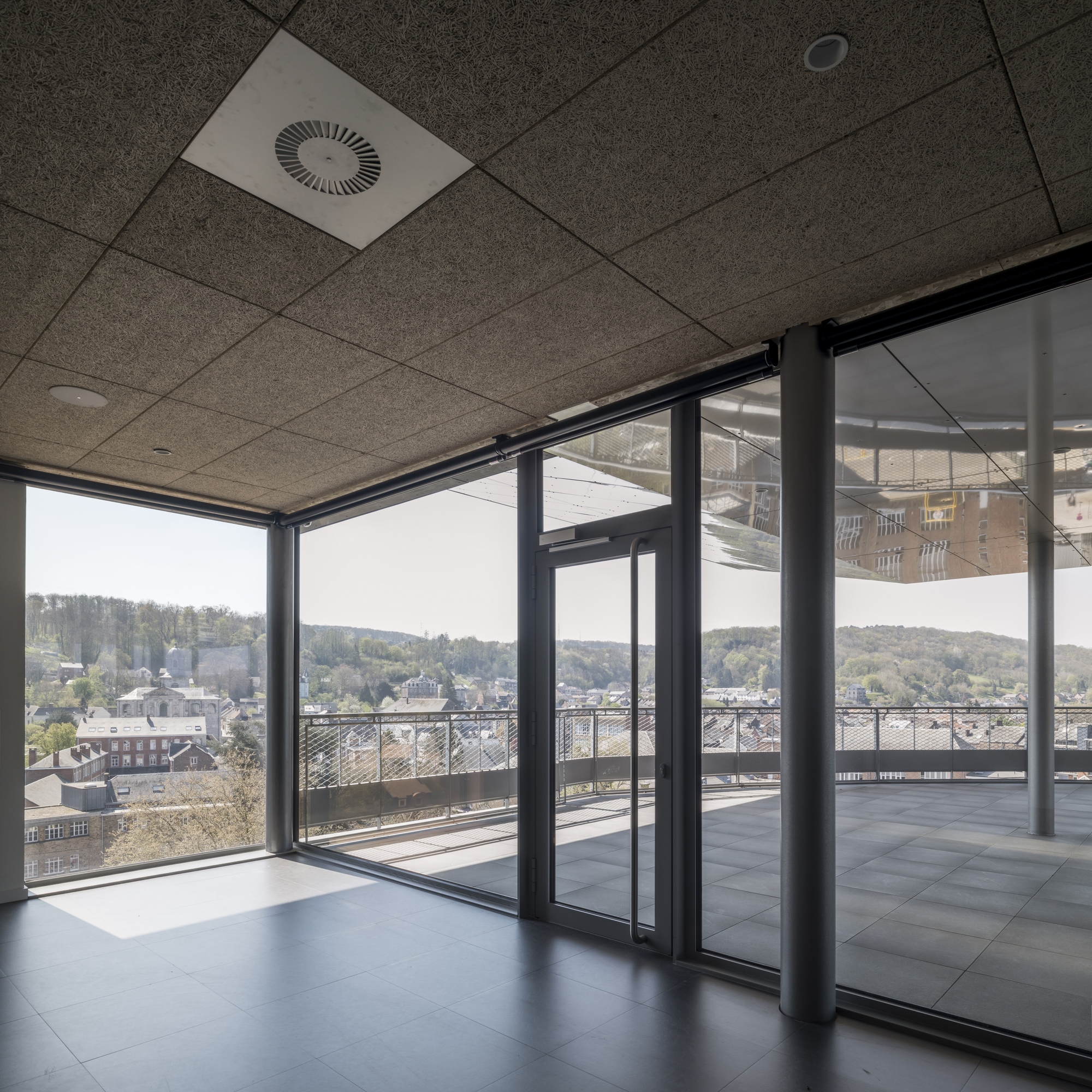 Une salle polyvalente prolongée d’une terrasse panoramique couronne l’édifice. Le plafond de la terrasse est revêtu d’aluminium qui renvoie la lumière et les reflets.