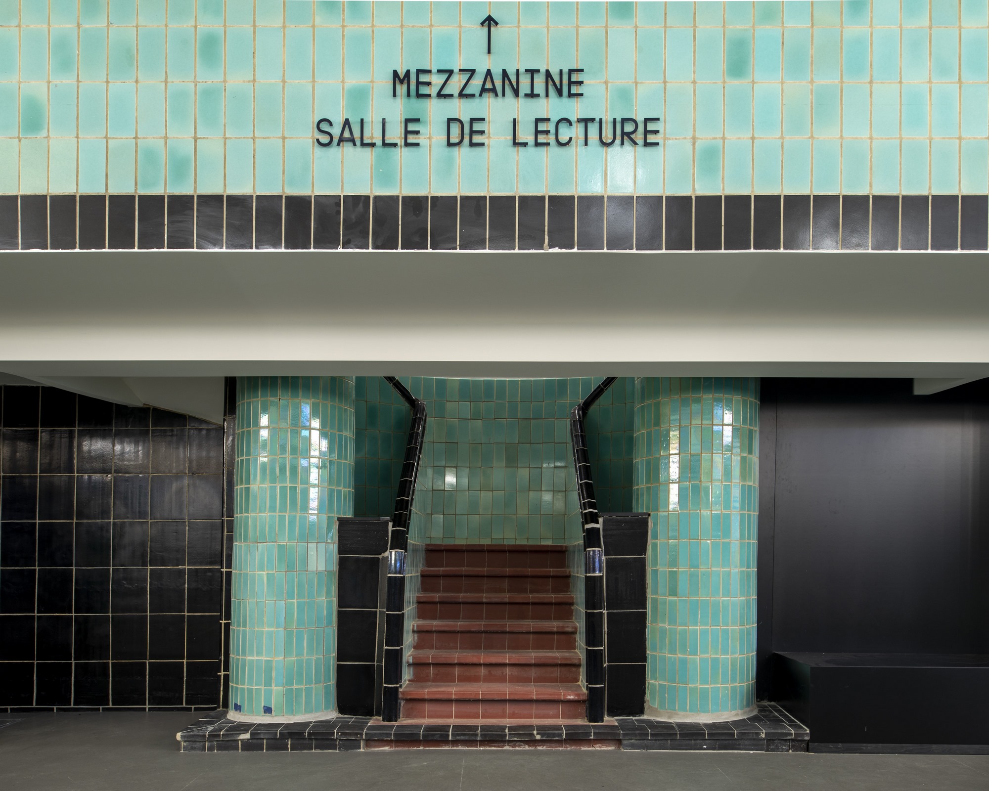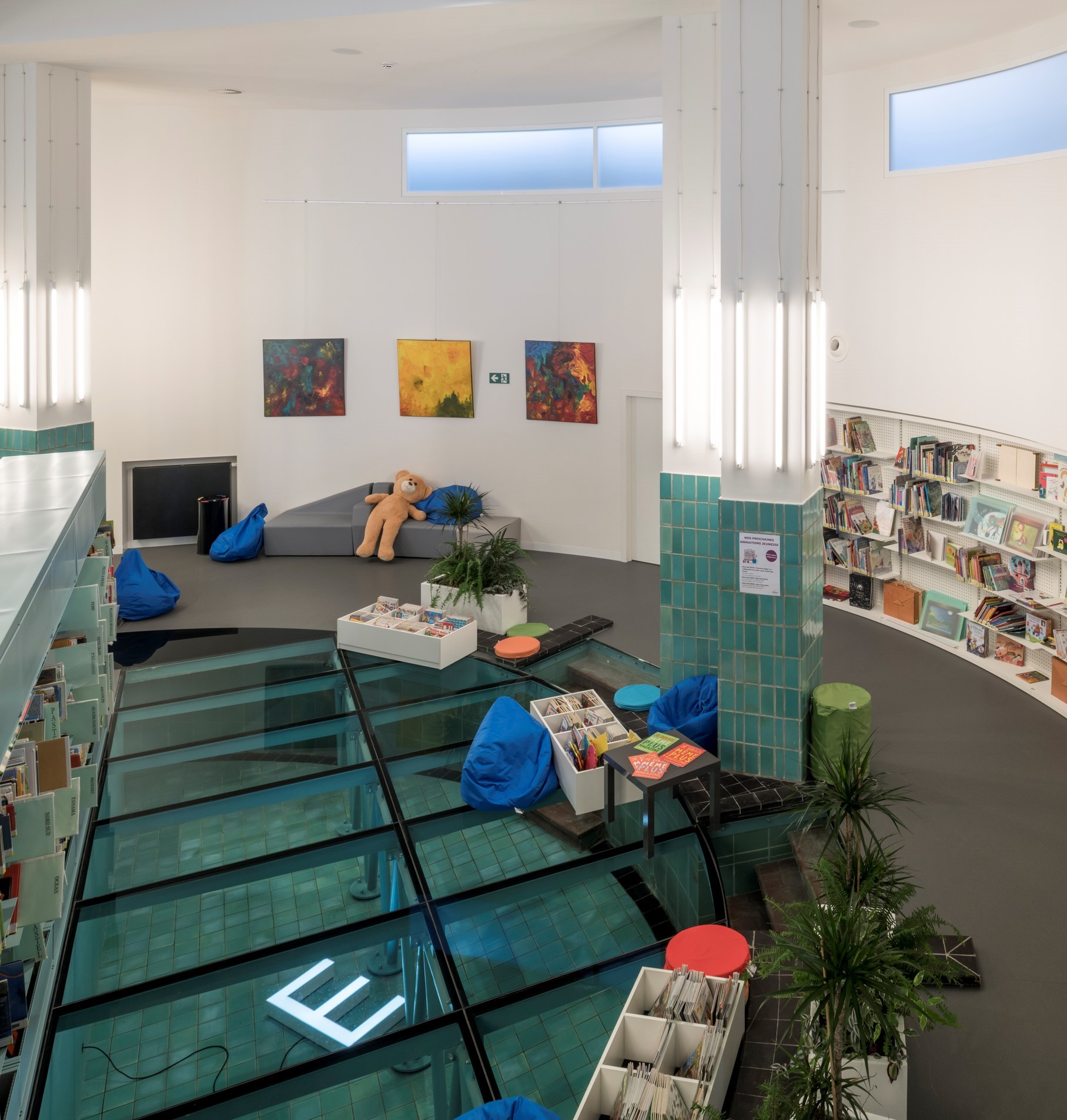 Dès l’entrée, on perçoit l’organisation originale du projet. Le sol transparent de la bibliothèque laisse percevoir le bassin : on voyage sur un plancher vitré avant de s’évader par la littérature. Cette métaphore poétique, qui met en lumière la nature commune, d’outil d’émancipation, de ces 2 équipements, est un élément central du processus d’entrée.