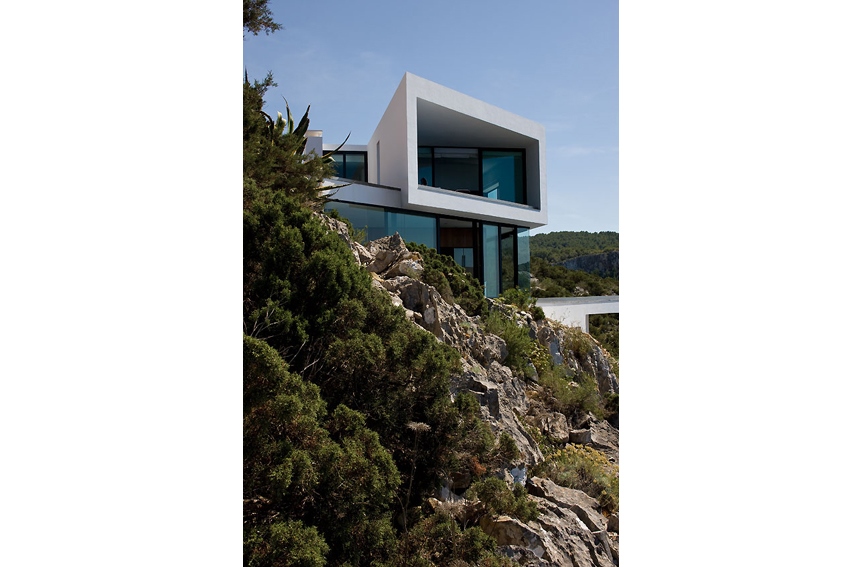 - A la manière d’un chemin qui trébuche, faute de ne pouvoir aller plus au Nord, le sol se froisse jusqu’à devenir escalier pour nous déposer sur le pont inférieur d’où l’on peut embrasser le paysage. Les espaces de vie sont ceints d’un seul grand châssis qui n’oppose pas de résistance à la vue ; par contre, il protège les lieux des vents parfois violents. Il se poursuit également côté patio, espace enclos qui s’offre pour seconde façade la roche taillée de la falaise, coiffée d’une haie d’oliviers. Latéralement, pour se faire discrète, la piscine se projette dans le paysage par-delà la terrasse. Soigneusement déposés sur la dalle, quelques murs et colonnes supportent le solide volume d’étage qui distribue les chambres. A 159 mètres d’altitude, aucun artifice ne vient concurrencer la nature, calme et sereine sous un ciel bleu, dramatique et tourmentée sous la tempête.[...]
