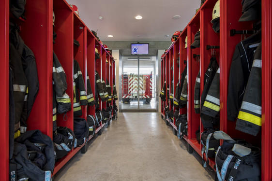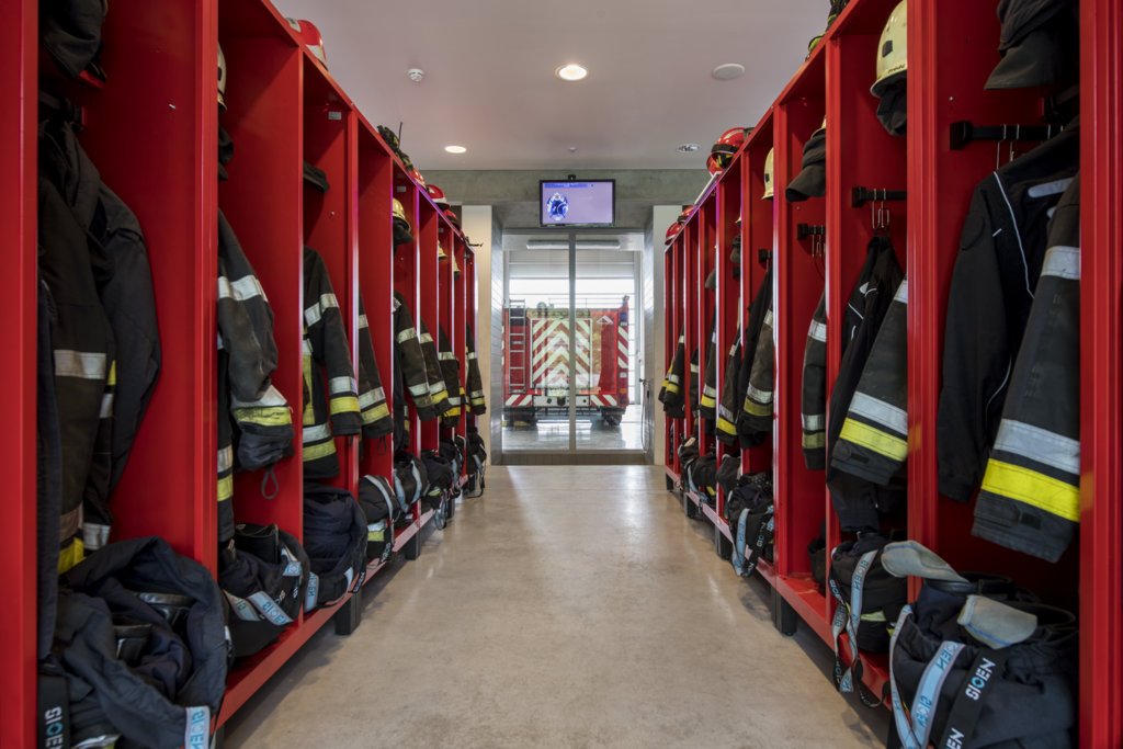 Entre le parking et le garage vient se placer le vestiaire. Il est le prisme au passage duquel le civil se transforme en pompier.