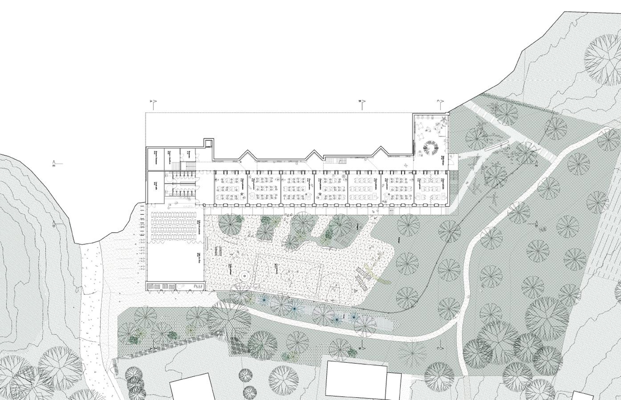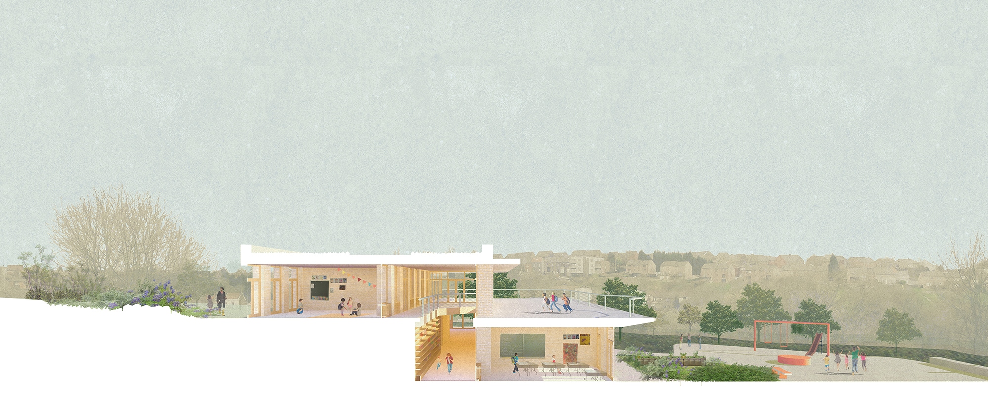 Perçu depuis le site actuel de l’école, le paysage paraît fermé par la topographie et fragmenté par les infrastructures. Mais vu d’en haut, le paysage redevient ouvert et lisible. Le regard s’étend jusqu’à l’horizon des collines voisines. On devine Grâce-Hollogne et Seraing de l’autre côté de l’autoroute, et puis la Meuse en contrebas. On voit la course du soleil. Le premier principe est donc de concevoir l’école comme un long balcon tourné vers le paysage. En contrepartie, un volume contenant les fonctions bruyantes (sport, fête, réfectoire) est implanté parallèlement à l’autoroute pour protéger les espaces de classe et de récréation contre le bruit de cette dernière et des vents importants sur la ligne de crête.