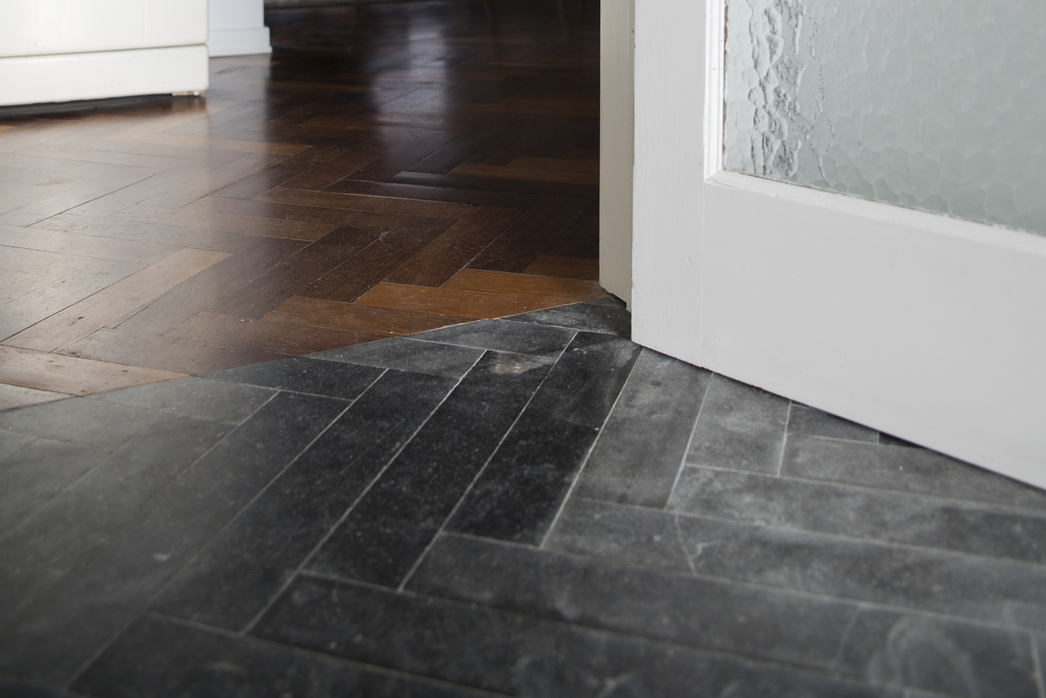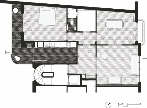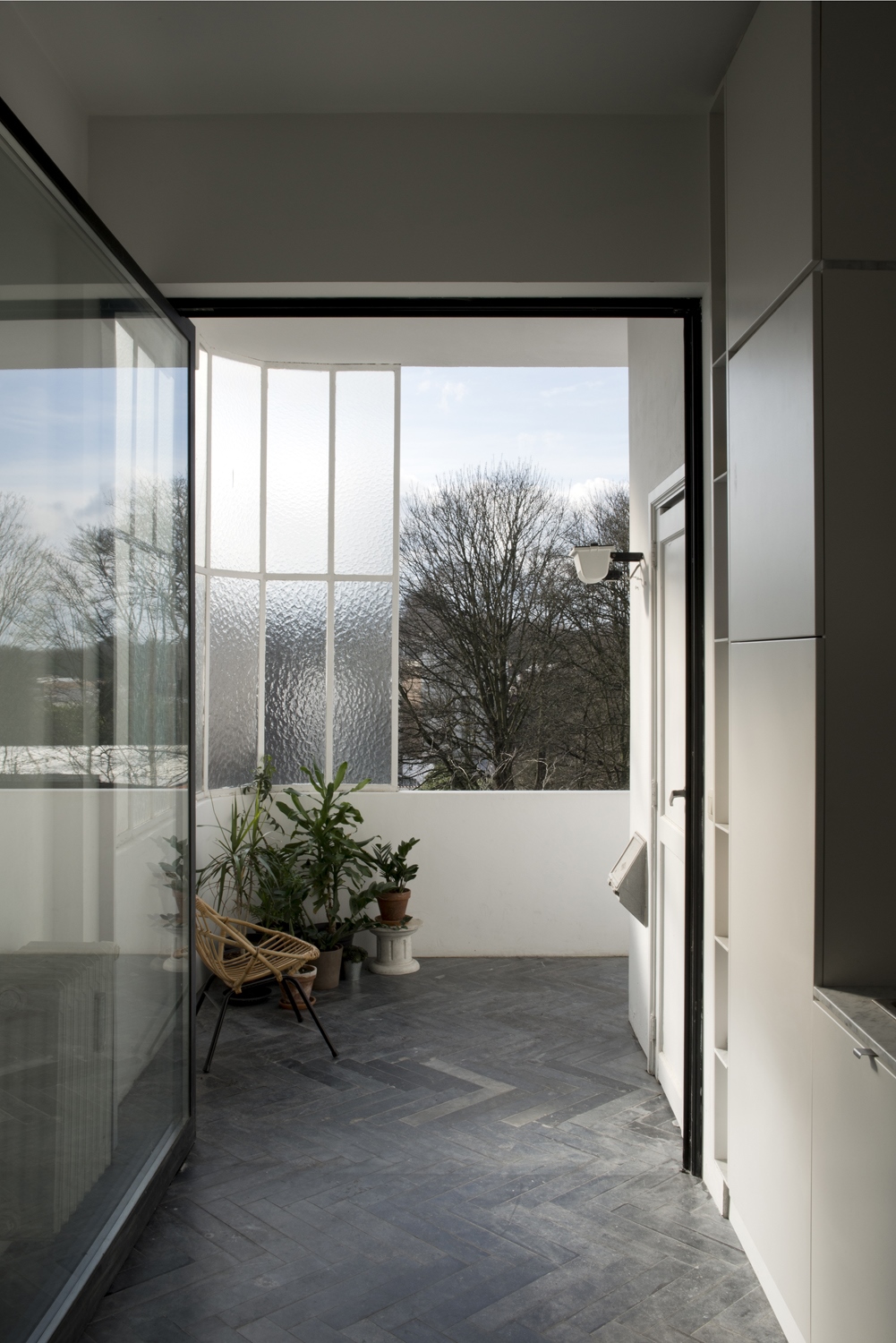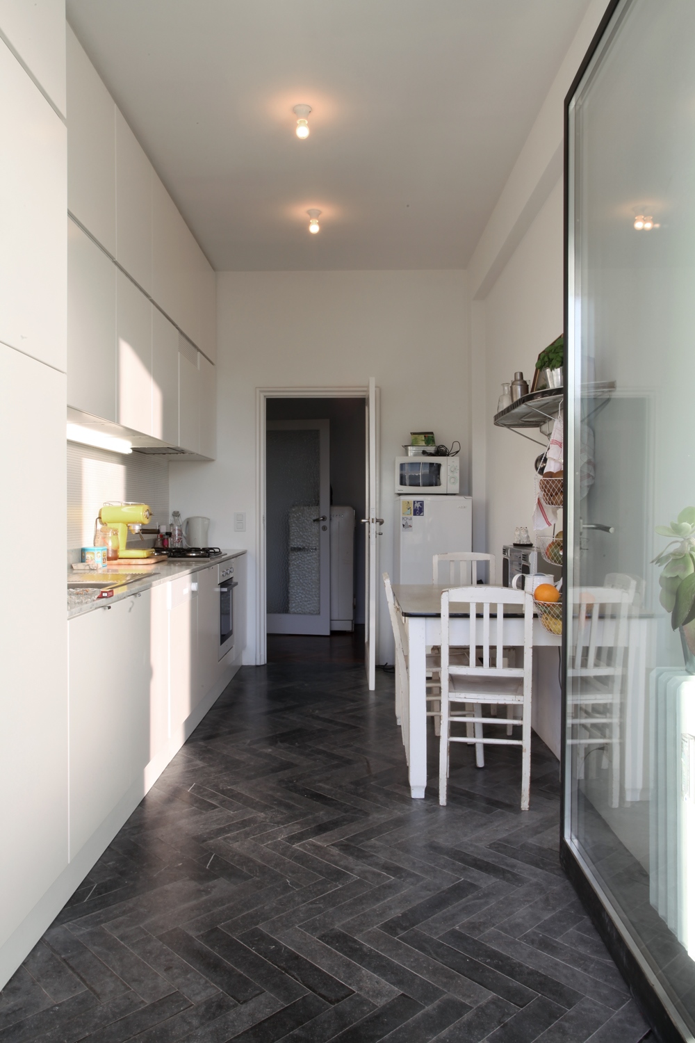 - Cet immeuble d’après-guerre est placé entre le quartier de l’Université Libre de Bruxelles et l’avenue des ambassades F.Roosevelt. L’appartement est au 6ème étage, traversant d’Est en Ouest et donne sur une place dégagée en façade avant et sur des jardins en intérieur d’îlot. L’appartement, une chambre à l’origine, avait été transformé en un appartement 2 chambres procurant un intérêt locatif pour des étudiants mais laissant un salon / salle-à-manger de taille réduite. La rénovation vise alors à rendre à l’appartement son standing initial. Pour cela, les espaces donnant sur la place ont été reconnectés en 1 seul grand espace lumineux. A l’arrière, une terrasse de service en contact avec la cuisine, se prolongeait en un balcon devant la chambre auquel celle-ci n’avait pas accès. Le balcon, en cul de sac, devenait alors l’espace «dépotoir». Afin de revaloriser cet espace extérieur et lui redonner une fonction d’agrément, des baies vitrées ont été installées permettant la sortie depuis chacune des pièces vers l’extérieur. Par ces deux interventions avant et arrière, les espaces initialement cloisonnés ont été libérés. Cette libre circulation dans tout l’appartement est matérialisée par le pattern à bâton rompu du parquet d’origine que prolongent des plaquettes de pierre bleue belge dans la cuisine et sur la terrasse créant une unification des revêtements de sol.[...]