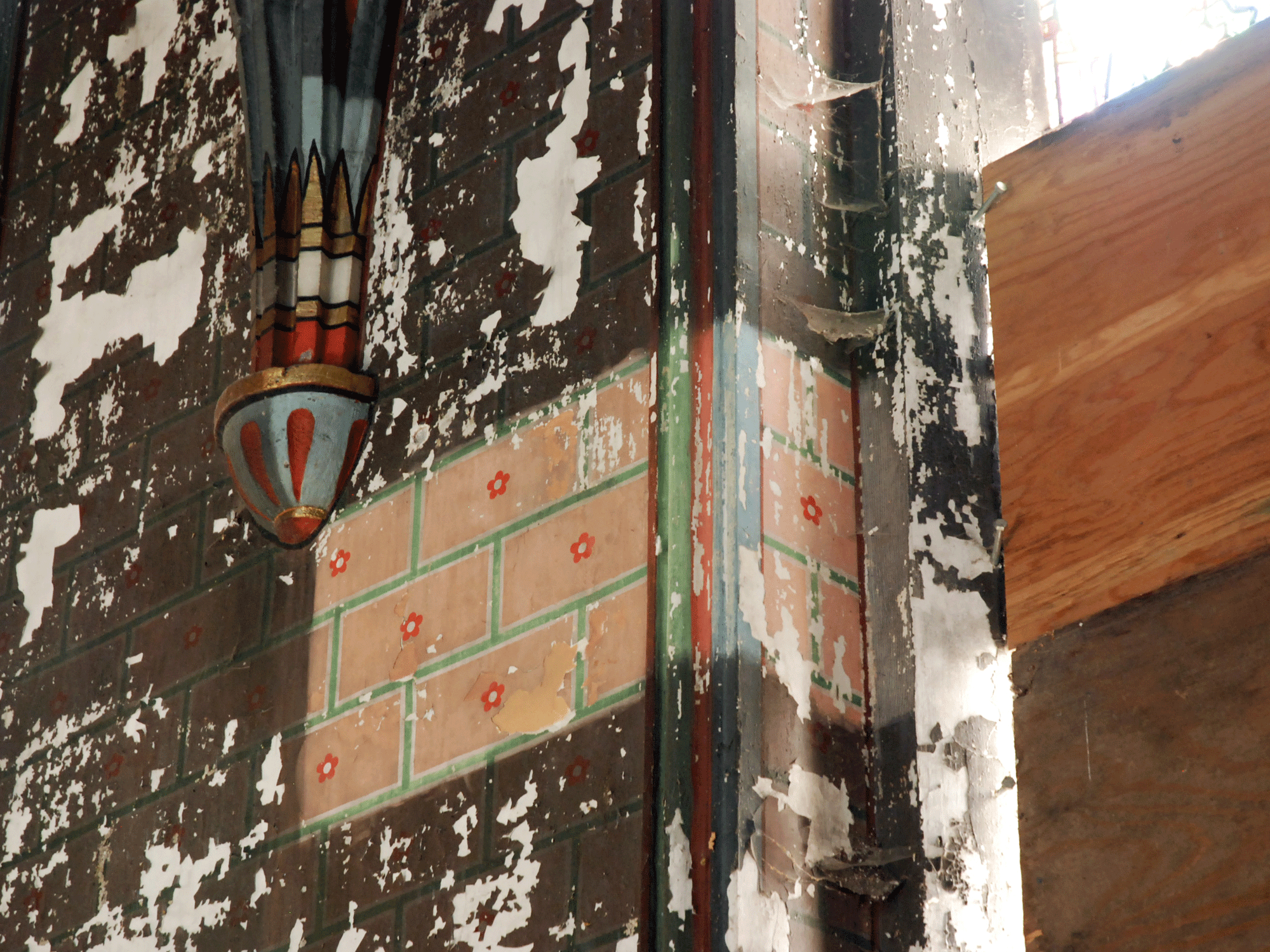 Les signes et l’usure du temps ne sont pas niés ou effacés, Les peintures murales néogothiques sont préservées et les lacunes sont assumées comme histoire intégrante du bâti.