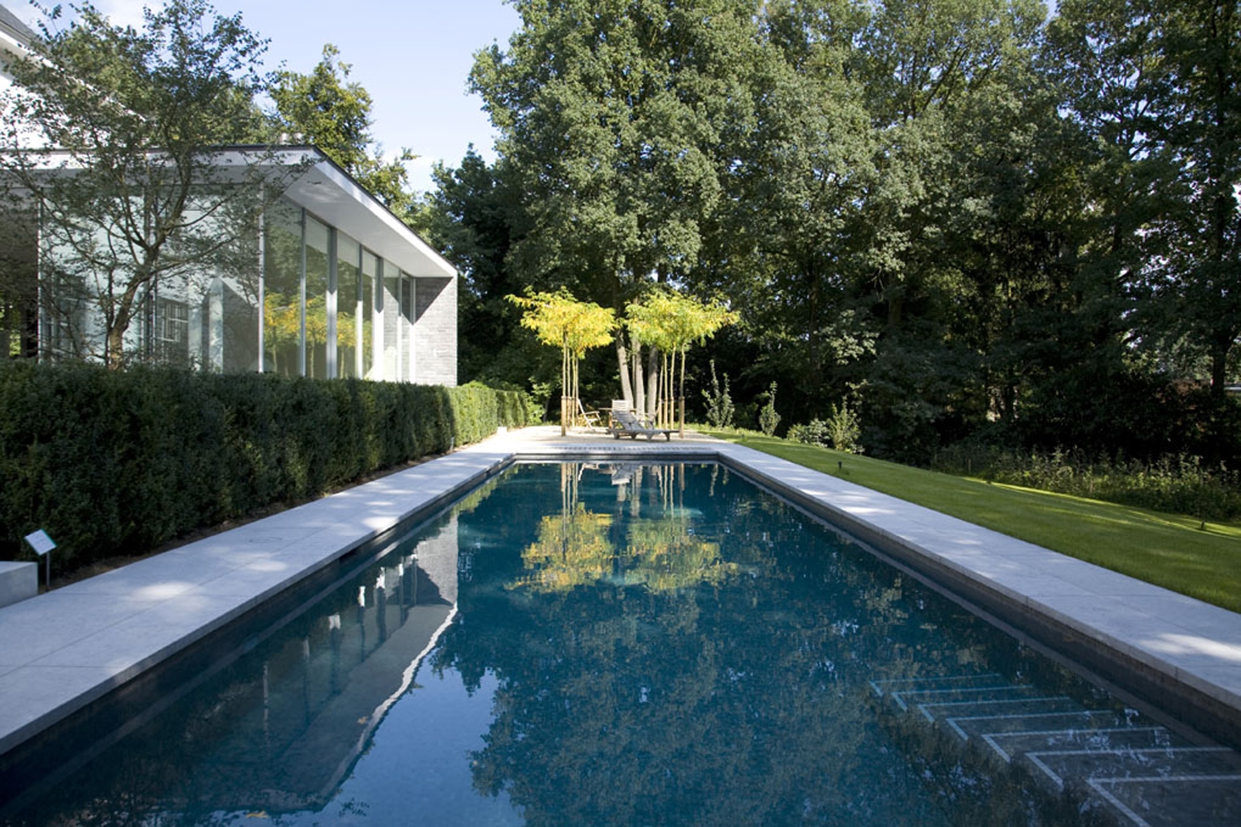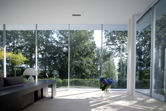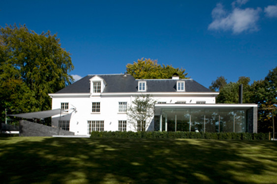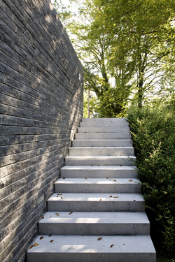 - La rénovation de cette vaste maison bourgeoise d’une architecture conventionnelle s’est faite en deux phases. La première a consisté à recréer des espaces intérieurs d’une spatialité apaisante et épurée. Entre les pièces trop compartimentées du rez, des circulations traversantes, qui longent la façade, ont été créées et apportent des perspectives ainsi qu’une tout autre relation avec la lumière extérieure. Elles définissent un bureau et une bibliothèque qui s’isolent comme une boîte dans l’espace fluide du séjour. La seconde phase a consisté à bâtir une extension vitrée qui ouvre le séjour sur le jardin ainsi qu’une terrasse dont le niveau inférieur forme un vaste espace bien être. Le plus grand soin a été mis dans les matières peu nombreuses agencées de manière à dialoguer et à créer une impression chaleureuse.[...]