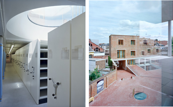 Prolongation du sous-sol du bâtiment rue de Nimy sur toute la profondeur de la cour pour créer un socle d’archives. Il établi le lien entre toutes les fonctions autant par le dessus que par le dessous.