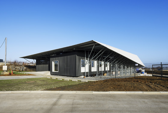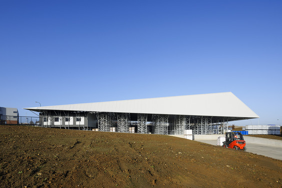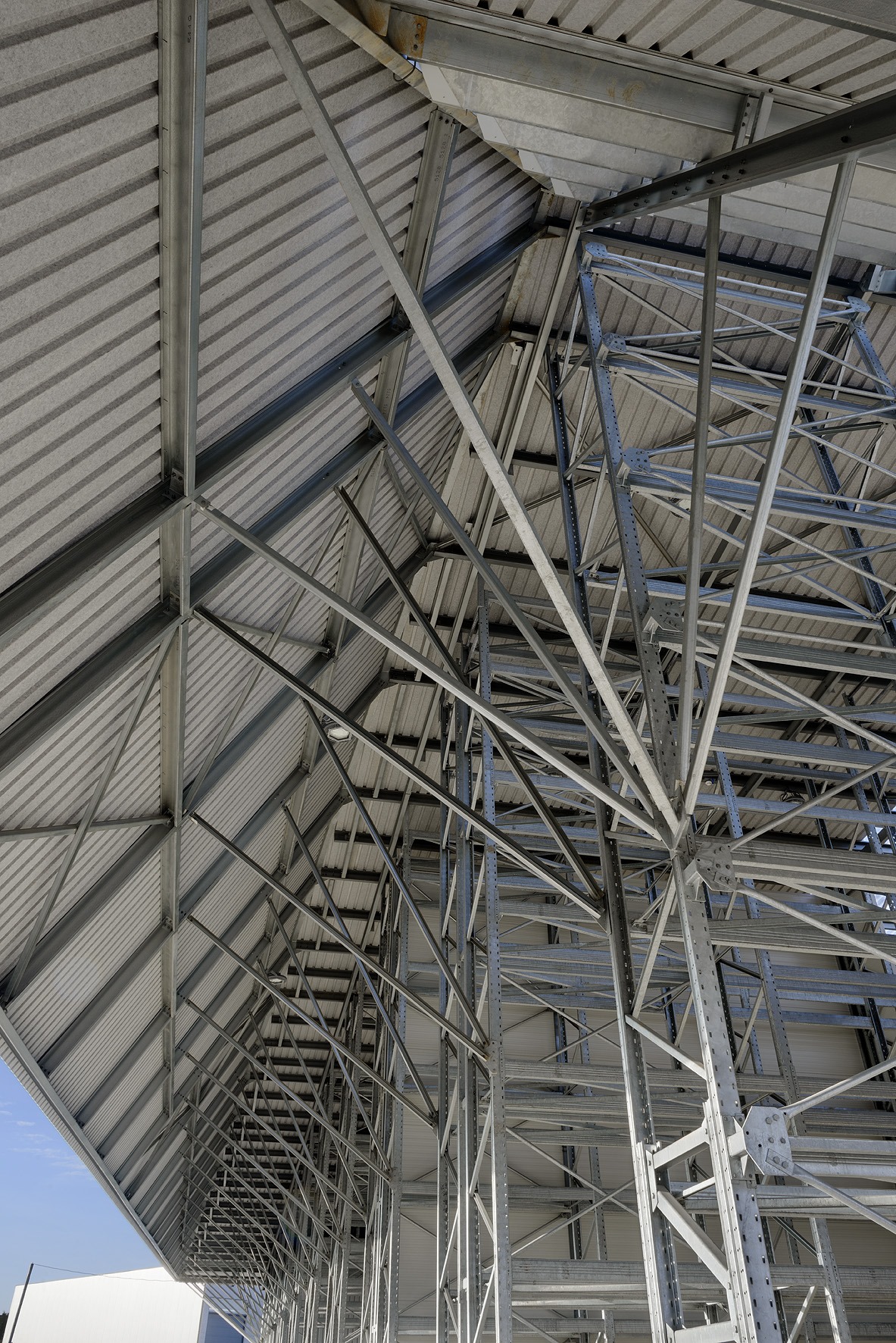 - Le système constructif de ce hall de stockage de produits chimiques est basé sur l’utilisation de rayonnages à palettes comme éléments porteur de la toiture. Le hall étant ouvert, les rayonnages contribuent à l’esthétisme de la façade.[...]