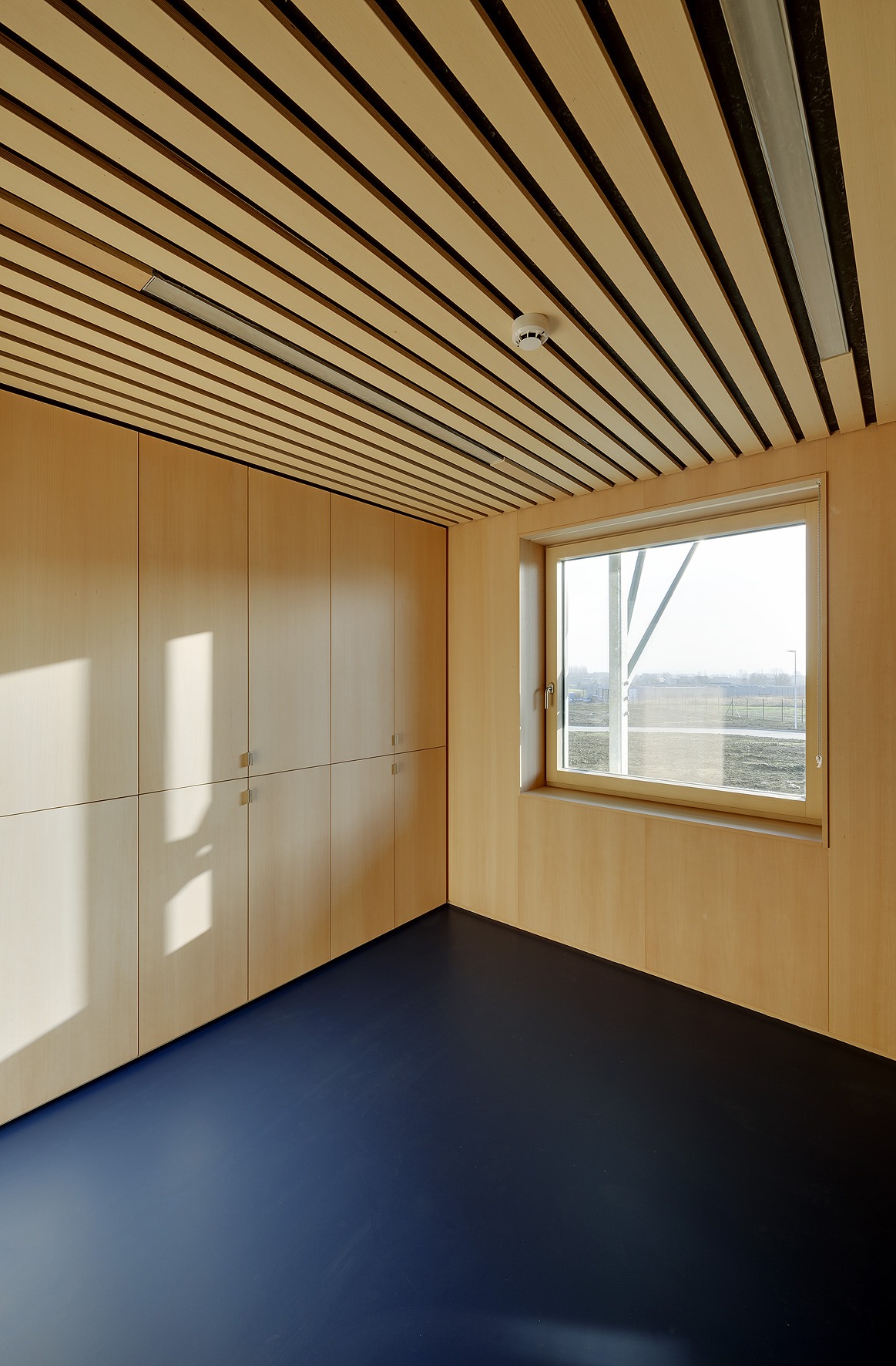 La cohérence visuelle de l’ensemble du projet est garantie par l’usage de la tôle ondulée en parement de façade et en toiture (tant pour hall que pour le volume des bureaux). Cependant, c’est le bois qui a été choisi pour la structure et l’intérieur des bureaux afin de leur conférer un caractère chaleureux. Ce matériau contraste totalement avec l’aspect brut et industriel du reste du projet. Toutes les faces de la boîte des bureaux ainsi que celle des placards intégrés sont réalisées en panneaux de multiplex de hêtre blanc non traité. Les portes des locaux techniques, également revêtues de ces mêmes panneaux, disparaissent dans la cloison du couloir. Tous ces éléments donnent une véritable continuité visuelle à l’intérieur du volume et lui confèrent sa grande unité.