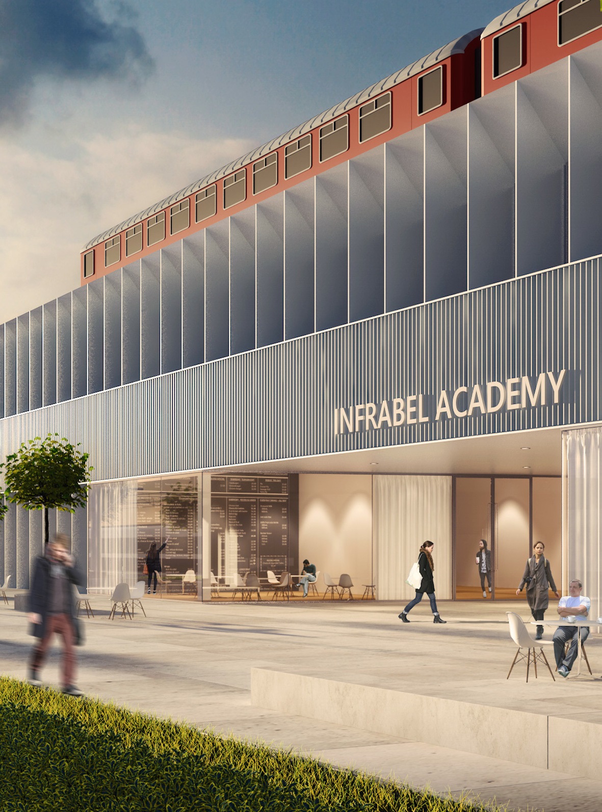 - Le projet résulte de la nécessité de centraliser les formations d’Infrabel à Bruxelles. Le bâtiment est dédié à la formation professionnelle pour des travaux d'exploitation et de maintenance pour Infrabel. Le projet comprend des ateliers et des espaces extérieurs pour des travaux en lien avec les lignes aériennes, les voies et les aiguillages ferroviaires, ainsi que des espaces de formation et des simulateurs pour le contrôle électrique et électronique.[...]