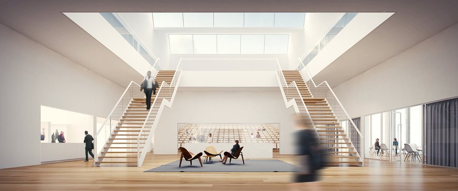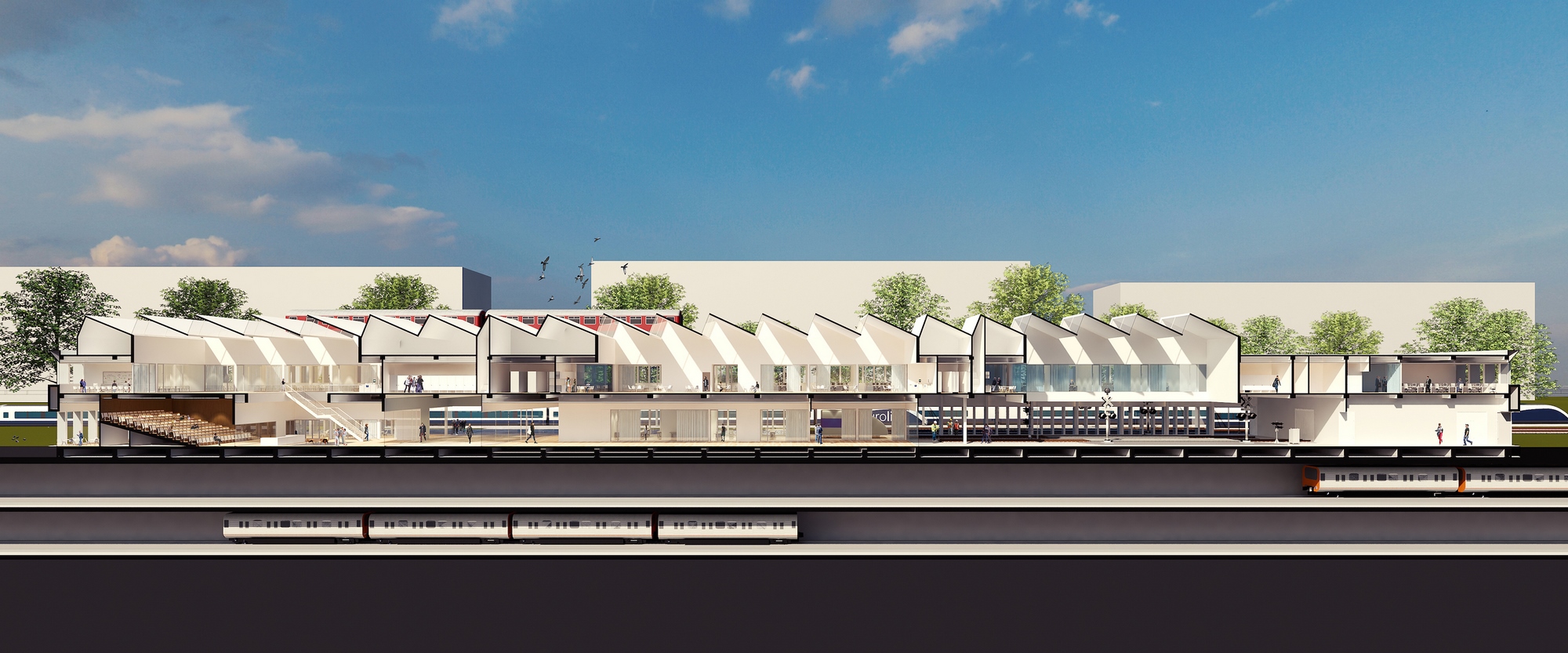 Par sa volumétrie, sa longueur et son implantation parallèle aux éléments structurants, le bâtiment s’intègre dans son contexte. Le recul du bâtiment permet de réaliser un parvis côté voies. La façade ouest est traitée comme une façade principale, elle est largement vitrée pour accueillir les visiteurs venant à pied ou en vélo. Imaginé comme un campus ouvert, le site se veut accessible à tous.