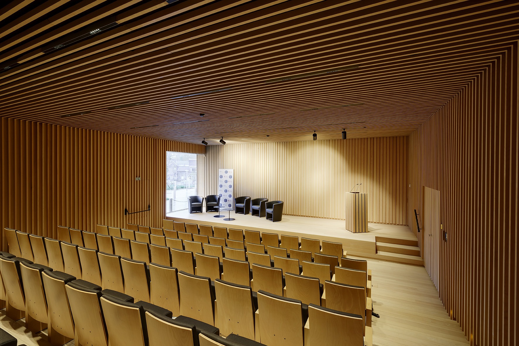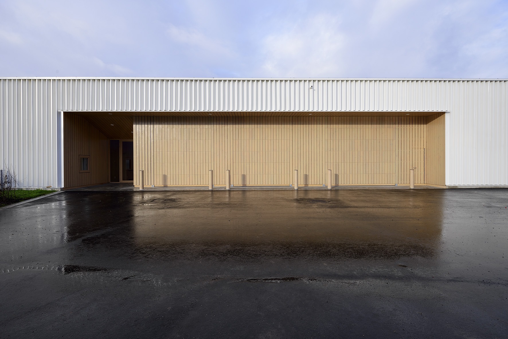 Des creux dont les faces sont bardées de bois sont réalisés dans la peau unitaire des bâtiments. Les portes techniques s’y intégrant sont également bardées et passent inaperçues.