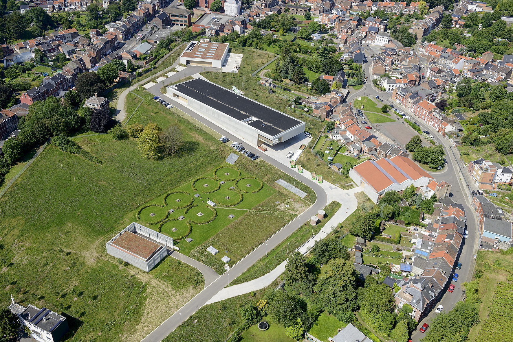 - Le site est implanté à Ans, près de Liège. Ni le bâti, ni le parcellaire, ni la végétation ne structure le site. Seul le relief et la pente du terrain vers Liège marquent l’espace. L’objectif est de retrouver le site à son état naturel en intégrant les bâtiments de traitement et d’entretien sur le relief et éviter le stéréotype de l’usine plantée au milieu d’une plateforme.[...]