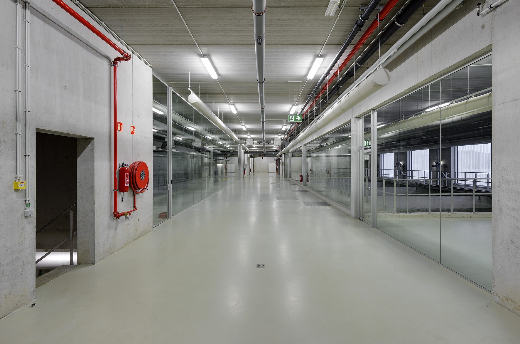 La station de traitement des eaux est recouverte d’une double peau en bardage métallique perforé de teinte blanche permettant de placer en arrière-plan tous les percements techniques et équipements extérieurs. L’espace interstitiel qu’elle libère permet de placer deux passerelles de circulation technique qui servent localement de chemin d’évacuation.