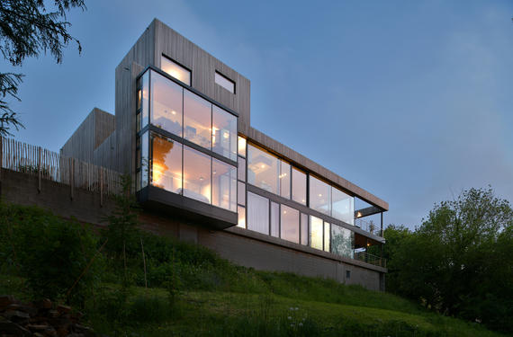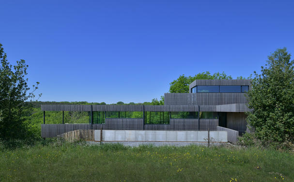 Le volume se développe ensuite sur un niveau inférieur, formant ainsi une façade entièrement vitrée sur deux niveaux offrant à chaque pièce qui la compose un regard sur les étendues boisées qui habillent la vallée.