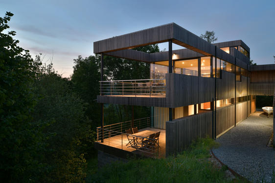 Un volume visuellement contrastant de l’ensemble homogène de l’habitation, propose aux habitants un espace déconnecté, tel une cabane en forêt qui profite de son promontoire pour donner une vue panoramique sur le site.
