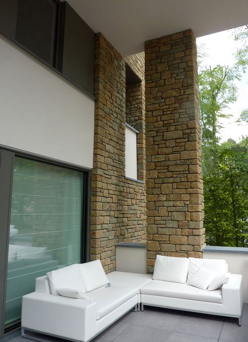 Les appartements disposent tous de très larges terrasses en encorbellement dans la cime des arbres. Ces terrasses, soulignées par des contours blanc, "déconstruisent" le volume strict de base. Ces bandeaux blancs courent sur le pourtour des villas soulignant et accompagnant les diverses ouvertures. De massifs murs de pierre du pays soutiennent les terrasses et ajoutent un effet multiple aux élévations.