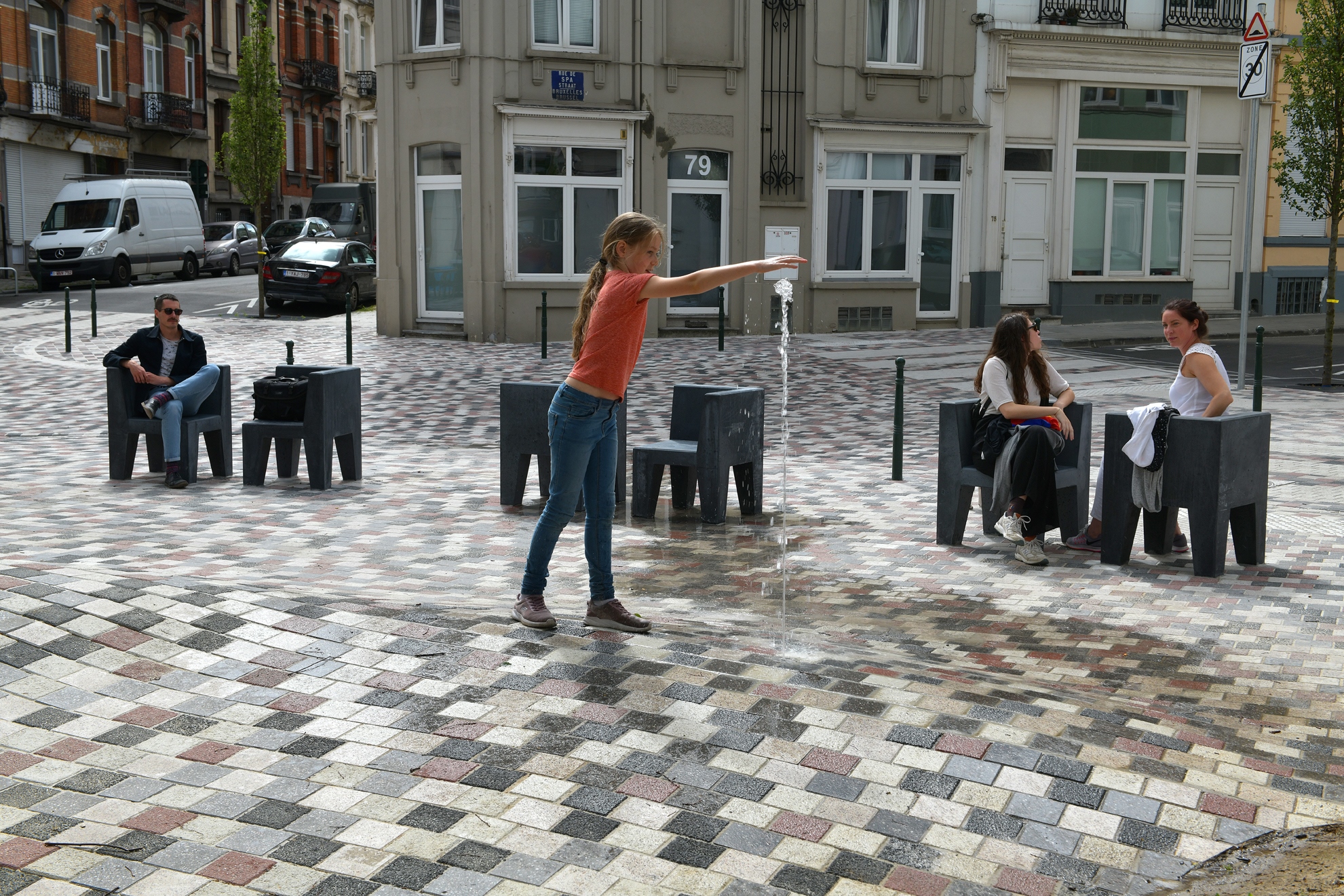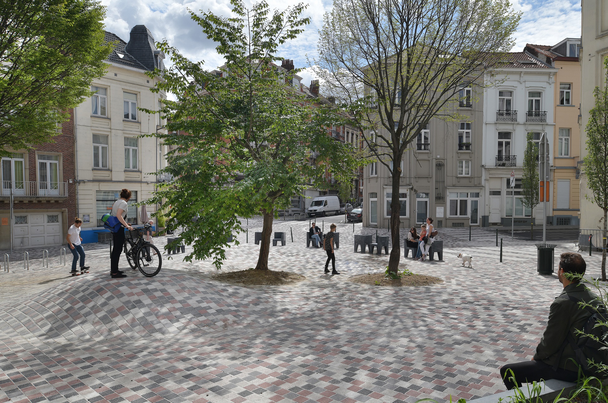 Le réaménagement urbain relève ainsi le défi de redéfinir la hiérarchie entre l'espace dédié à la voiture et l'espace piéton dans l'espace public. Les textures des chaussées sont homogénéisées sur toute la place, les routes sont surélevées jusqu'au niveau des trottoirs et délicatement délimitées. Les trottoirs et les terrasses sont agrandis en réduisant un peu plus encore la proportion d'espace attribuée à l'utilisation de la voiture. .es conducteurs roulent sur un "sol piétonnier" et adaptent en conséquence leur conduite et leur vitesse. La place elle-même agit comme le point focal des activités de loisirs, accueillant une végétation dense et des assises qui forment un demi cercle autour d'un jeu topographique et d'une fontaine comme aire de jeu informelle pour les enfants.