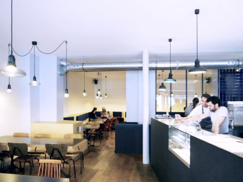 Pour son premier point de vente, cet enjeu s’est traduit spatialement en divisant le restaurant en deux sous-espaces, dédiés respectivement à l’expérience culinaire fuyante ou prolongée. L’espace avant est conçu pour une réception optimale des clients. Le comptoir oblique, à la fois dynamique et fonctionnel, oriente leur flux. Une fois leur commande complétée, ils peuvent soit se rendre dans l’espace arrière ou faire demi-tour et sortir avec leur commande sans devoir se frayer un chemin à travers la queue. Au fond du restaurant, l’atmosphère devient plus sombre et calme alors que nous pénétrons dans un espace introverti. L’élément déterminant est ici une banquette continue dont la géométrie particulière crée des alcôves et des recoins où l’on peut être soit seul, soit en grand groupe.