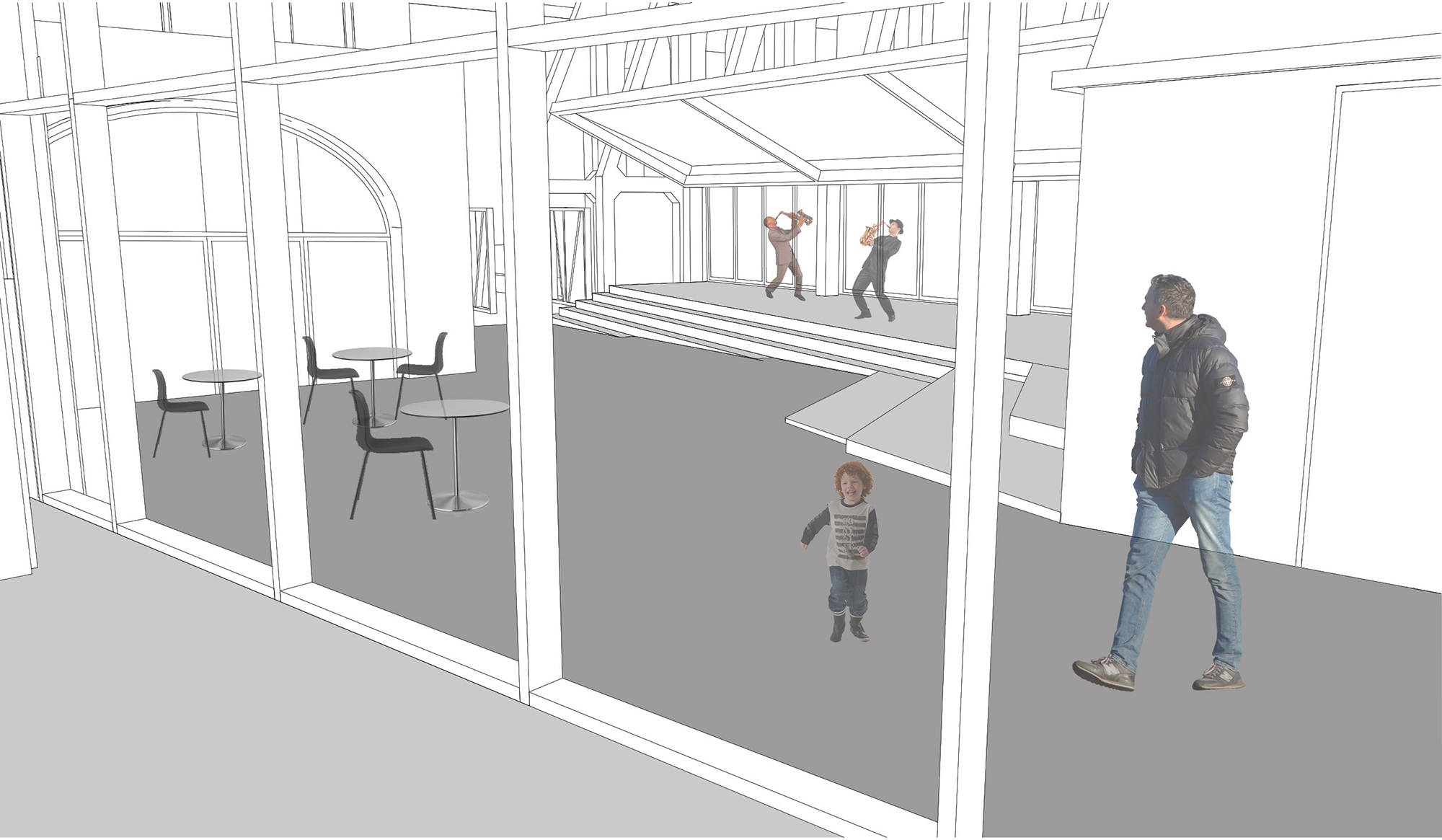 Dans cet esprit, la Salle du Cercle, amputée de son annexe pour s’ouvrir sur le parc est traversée par une longue galerie vitrée qui met en relation son entrée côté parc avec le côté cours.