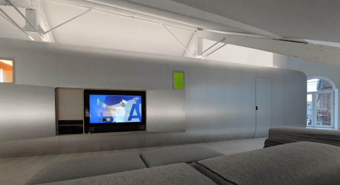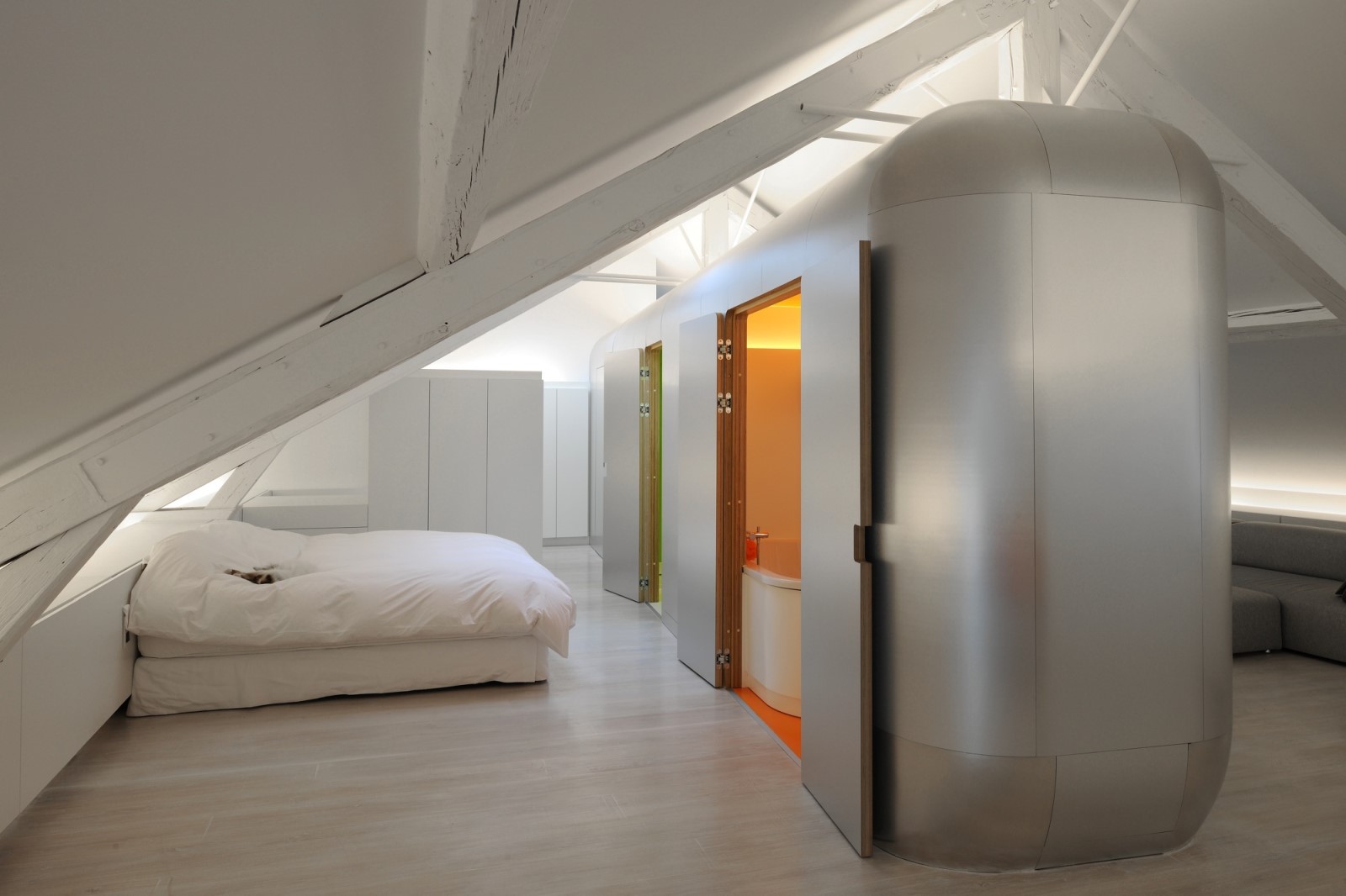 - Dans le cadre du loft Kempart, le programme est simple : aménager un espace de vie pour un couple sans enfant dans un comble dépendant d’un atelier de boulangerie industrielle désaffecté. Outre les nécessaires aménagements techniques, nos propositions portent essentiellement sur la distribution, la fonctionnalité et la sensibilité du lieu. Nous avons dans un premier temps dégagé l’espace au maximum et déplacé les entraits de la charpente qui a été renforcée par des plats métalliques enchâssés dans les arbalétriers. L’espace ouvert de 154 m2 a été alors structuré par l’implantation d’un module aux formes arrondies. Ce module loge deux salles de bains, divers rangements, une toilette et dissimule les systèmes d’isolation et d’aération.[...]
