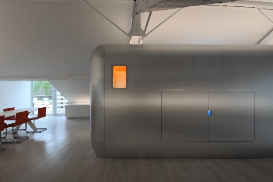 L’espace créé autour du module se retrouve virtuellement partagé pour répondre aux différentes fonctions et offrir diverses ambiances. Les fonctions sont, dans l’ordre depuis l’entrée : hall, bureau, salon, cuisine, salle à manger, chambre à coucher et dressing. Le salon est orienté coté sud tandis que la chambre est au nord. Le design du module est exclusif : l’étude de son profil, le choix de l’aluminium pour carrosser la structure et ses finitions très soignées l’apparentent à l’esthétique aérodynamique des caravanes américaines Airstream. Nous avons en outre fait appel à l’artiste plasticien Jean Glibert pour le choix des teintes saturées des pièces d’eau visibles du dehors par trois hublots.