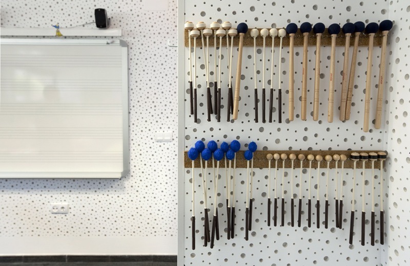 - École d’enseignement primaire (18 classes) et maternel ( 9 classes) destiné à +/- 650 étudiants. Intègre un gymnase, une partie administrative, sa propre cuisine et un réfectoire ainsi qu’un logement pour le concierge. La bloque intégrant la partie primaire comporte 2 niveaux et le volume revêtit du parement en brique blanche imbrique un volume renfermant les parties communes de couleur noir. L’espace réservé aux plus petits est rythmé par des boites de couleurs agrumes qui rappellent les gammes de couleurs des champs de fruits avoisinants.[...]