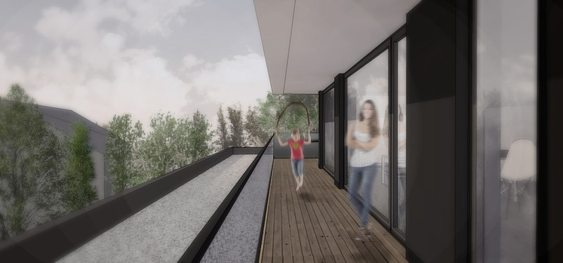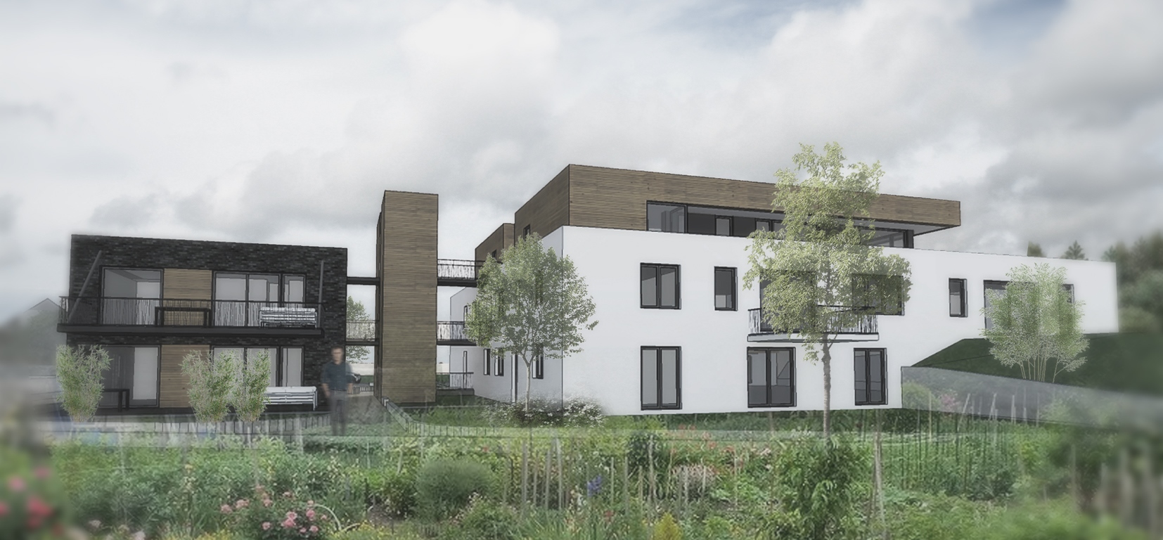 - Réhabilitation et extension d'un ancien bâtiment industriel en un immeuble résidentiel de dix logements. Le bloc existant est un volume sensiblement rectangulaire de deux niveaux, avec une configuration de toitures à 2 versants en asbeste-ciment perpendiculaire à la voirie. Le démontage des toitures et l'assainissement du bâtiment permettent l'élévation d'un étage en plus, avec ses façades en retrait, ce qui facilite l'émergence de deux penthouses au deuxième étage avec de grandes terrasses. Les deux autres appartements sont situées dans un bloc séparé au standard passif. Ces deux volumes sont articulés par un volume de circulation vertical, situé au milieu des deux entités. qui se communiquent à travers des passerelles externes légères.[...]