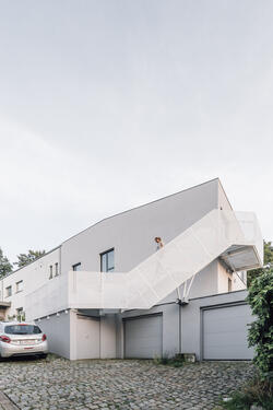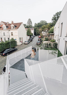 Vu le site exceptionnel, le jardin est naturellement attribué à l’appartement du rez-de-chaussée et l’étage se voit doter, dans un souci d’équité, d’une toiture terrasse de belle dimension. L’escalier est habillé d’une structure recouverte d’une maille métallique perforée qui, comme un fil conducteur de l’identité du projet, prend ses racines au droit de l’espace public pour culminer en brise-soleil pour la toiture terrasse.