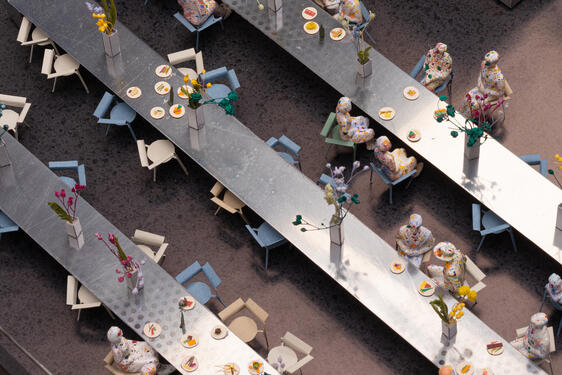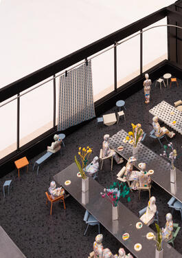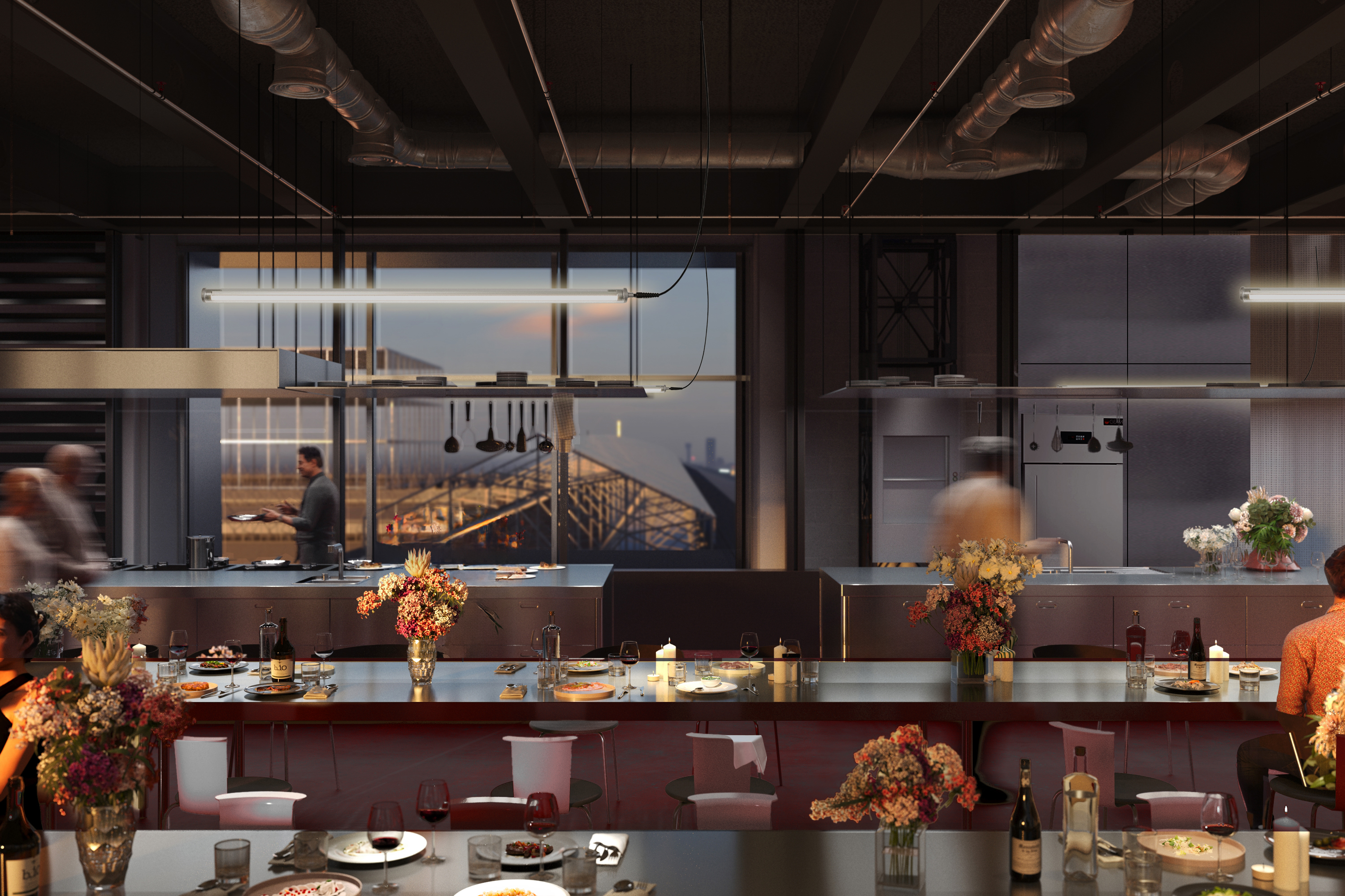 - Situé au cinquième étage du Showroom de Kanal Centre Pompidou, la proposition gagnante pour le restaurant exploite tout son potentiel en offrant une vue sur la ville. Le projet estime qu'une destination gastronomique contemporaine ne doit pas être un espace d'exclusion, mais bien un lieu d'inclusion et intégrant les paramètres culturels, spatiaux et urbains. Des recherches approfondies ont été menées sur l'histoire et le futur de la gastronomie et de la culture culinaire contemporaine à Bruxelles, afin de répondre aux nombreuses ambitions du Kanal-Pompidou. Trois tables de 11m de long occuperont l'espace et serviront de base à un restaurant public et à de nombreuses mises en scène. Des arrangements subtils de faisceaux lumineux étroits, des compositions florales, des dessertes et un design élégant de chaises contribuent à créer la séparation nécessaire entre les différents dîners, sans empêcher leur rencontre. En centralisant l'espace de restauration, nous avons libéré le périmètre de la pièce pour tout le monde. Les tabourets, les tables d'appoint et les bancs sont disposés de manière à inviter les gens à s'attarder le long de la façade. La cuisine et le bar constituent une quatrième table dans la pièce, ne présentant pas le restaurant uniquement comme un espace de consommation, mais plutôt comme un environnement productif, où les clients, les chefs, les cuisiniers et les serveurs se déplacent ensemble dans un effort collectif afin de rendre ce magnifique repas possible.[...]