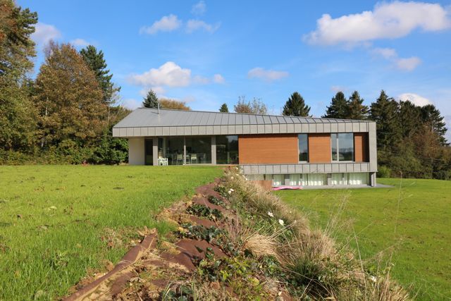 - L’environnement direct de cette habitation est marqué par une grande diversité architecturale. La parcelle concernée est la dernière avant la zone de parc située plus haut. Cette parcelle ne fait pas partie du lotissement situé en contre-bas et ses caractéristiques (dimensions, vue, dénivellation, ...) lui confère un statut particulier permettant ainsi une approche urbanistique et architecturale différenciée.[...]