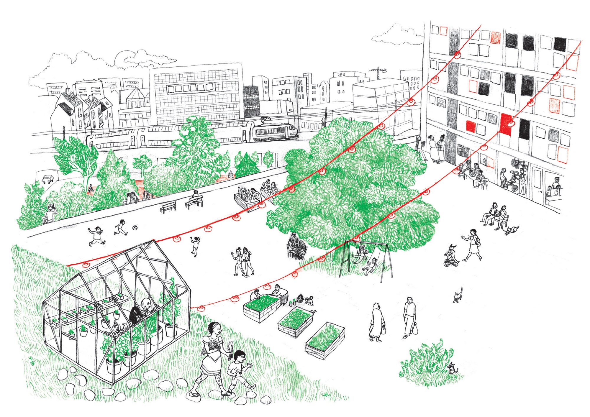 - Espace public, rénovation du rez de la tour pour des activités collectives, construction d’un atelier pour le travail du bois et du métal