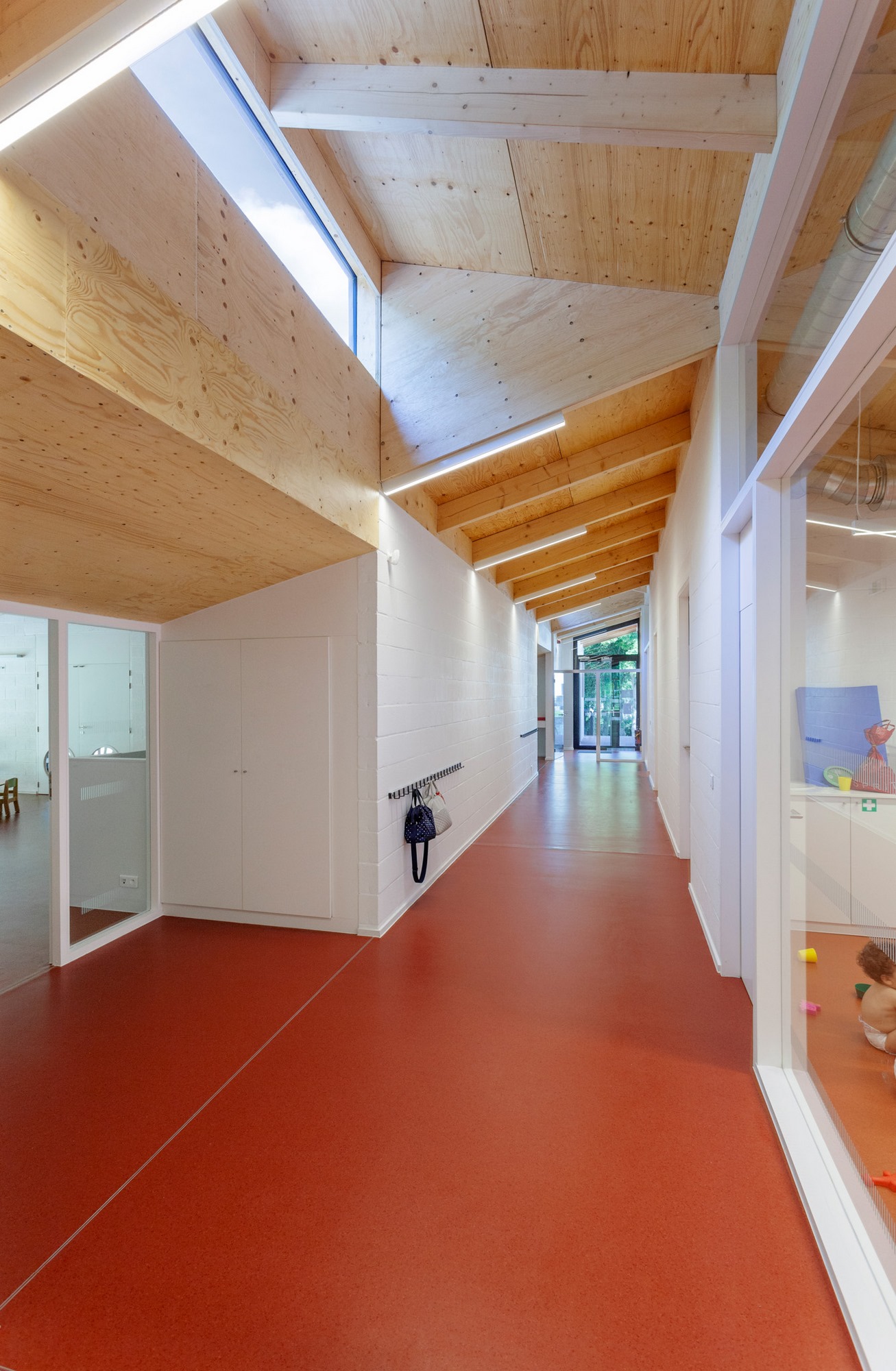 Le sol est traité dans un rapport direct avec l’extérieur par la continuité chromatique de son revêtement. Les murs blancs revoient à la légèreté et la transparence. Enfin, la charpente en bois se déploie comme une ramure créant des dilatations spatiales et des séquences visuelles.