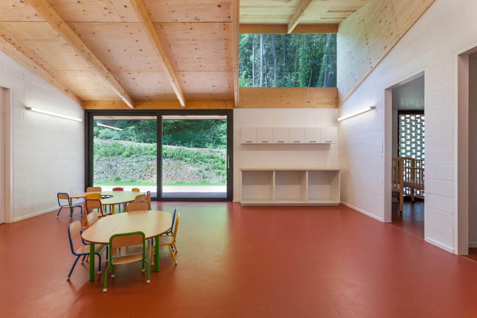 - L’orée d’un bois, l’endroit idéal pour implanter une crèche. Tournée vers la nature, celle-ci offre aux enfants un cadre sain, ludique et didactique. L’architecture proposée tire parti de cet environnement en orientant les espaces vers ce contexte féérique. Le bâtiment se développe de plain-pied, abrité sous une grande toiture débordante. La toiture, de par son emprise et sa forme franche, devient l’élément accrocheur à l’imaginaire ainsi qu’au contexte naturel et bâti.[...]