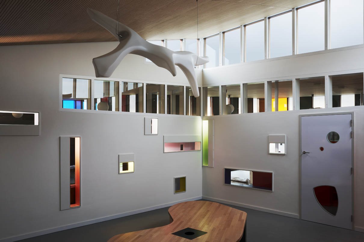 Les trois unités d’enfants s’organisent autour d’un atrium. Cette poche lumineuse, à la fois centripète et centrifuge, fonde et distribue toutes les activités du programme. A l’occasion, il sert de salle commune.