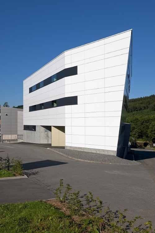 Au vu de ce site entièrement voué à la vitesse et à la compétition, nous avons voulu créer un bâtiment ayant un caractère dynamique, et même « aérodynamique ». L'horizontalité des panneaux de bardage ainsi que les longs ensembles de châssis noirs tracés dans la masse blanche sont là pour renforcer cette idée. Les façades sont des plans parfaits, l'ensemble des détails et raccords sont pensés pour renforcer l'aspect lisse et fini du volume.