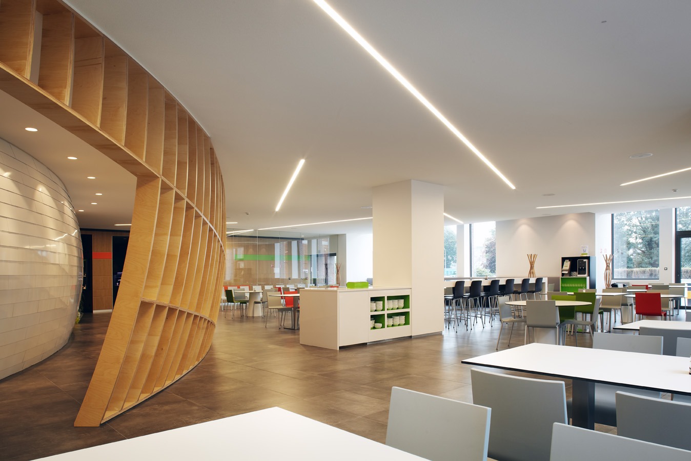 - Plus qu’un restaurant, le nouveau restaurant ELIA répond au principe du SWOW, Smart Way Of Working. C’est un lieu de rencontre et de convivialité pour le personnel, qui offre de multiples possibilités. Les cheminements sont fluides, une rue principale oriente naturellement le client vers le self-service aménagé au cœur d’un cocon translucide. Il est organisé en différents îlots qui proposent une cuisine diversifiée, chacun a la possibilité de faire son marché comme sur une place publique. Les espaces de restaurant se répartissent en zones distinctes, nous ne sommes pas dans une cantine. Le projet est plus qu’un restaurant, il offre des espaces polyvalents qui peuvent être utilisés de manière indépendante au cours de la journée que ce soit pour un séminaire, des réunions ou simplement pour prendre un bon café.[...]