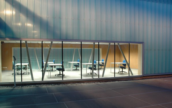 - Le terrain, le long de l’autoroute Bruxelles – Paris, s’inscrivait dans un contexte paysager particulier : c’était le seul endroit depuis lequel le beffroi montois restait visible pour l’automobiliste venant de Paris. Notre réponse est simple. Un volume bas, ouvert, horizontal abrite les locaux de formation. Il est perméable et les activités hébergées clairement visibles depuis l’extérieur (depuis l’autoroute et le parc Scientifique). Le bâtiment administratif, étroit et haut, est bardé d’une double peau de polycarbonate. Les vues sur la ville historique sont recadrées. Après avoir franchi une douve et longé la bibliothèque, on accède à l’entrée principale, à l’articulation des deux volumes. Derrière un écran vitré, une rue intérieure dessert les ateliers. Elle est rafraîchie par le bassin qui la borde. La vocation didactique et expérimentale s’exprime dans l’architecture et les systèmes énergétiques qui y sont intégrés : rafraîchissement par le bassin, panneaux solaires dans la double peau, stockage énergétique sous les ateliers, récupération par pompes à chaleur, chauffage autonome des bureaux, etc. L’ensemble demeure constamment visible et accessible aux stagiaires en formation.[...]