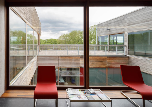 - Contextuellement, le zoning de Tournai-Ouest présente le taux de remplissage d’un site arrivé à maturité. Les fonctions «nobles», les besoins programmatiques en parkings sont tels qu’une grande partie de l’implantation se trouve mobilisée. Le centre s’installe donc sur pilotis et dissimule ainsi 50% des zones «véhicules». Le plateau «accueil et bureaux» s’organise au niveau +1, en plan carré très dense, percé d’un patio aérien générateur de lumière naturelle, de présence végétale et de regards croisés. Le niveau +2 contient les lieux collectifs, salles de réunions et cafétéria dans un plan cette fois en U enroulé sur le patio.[...]