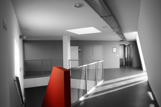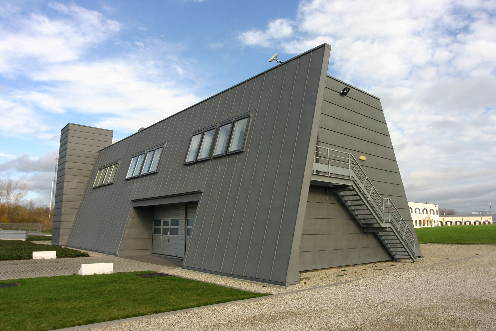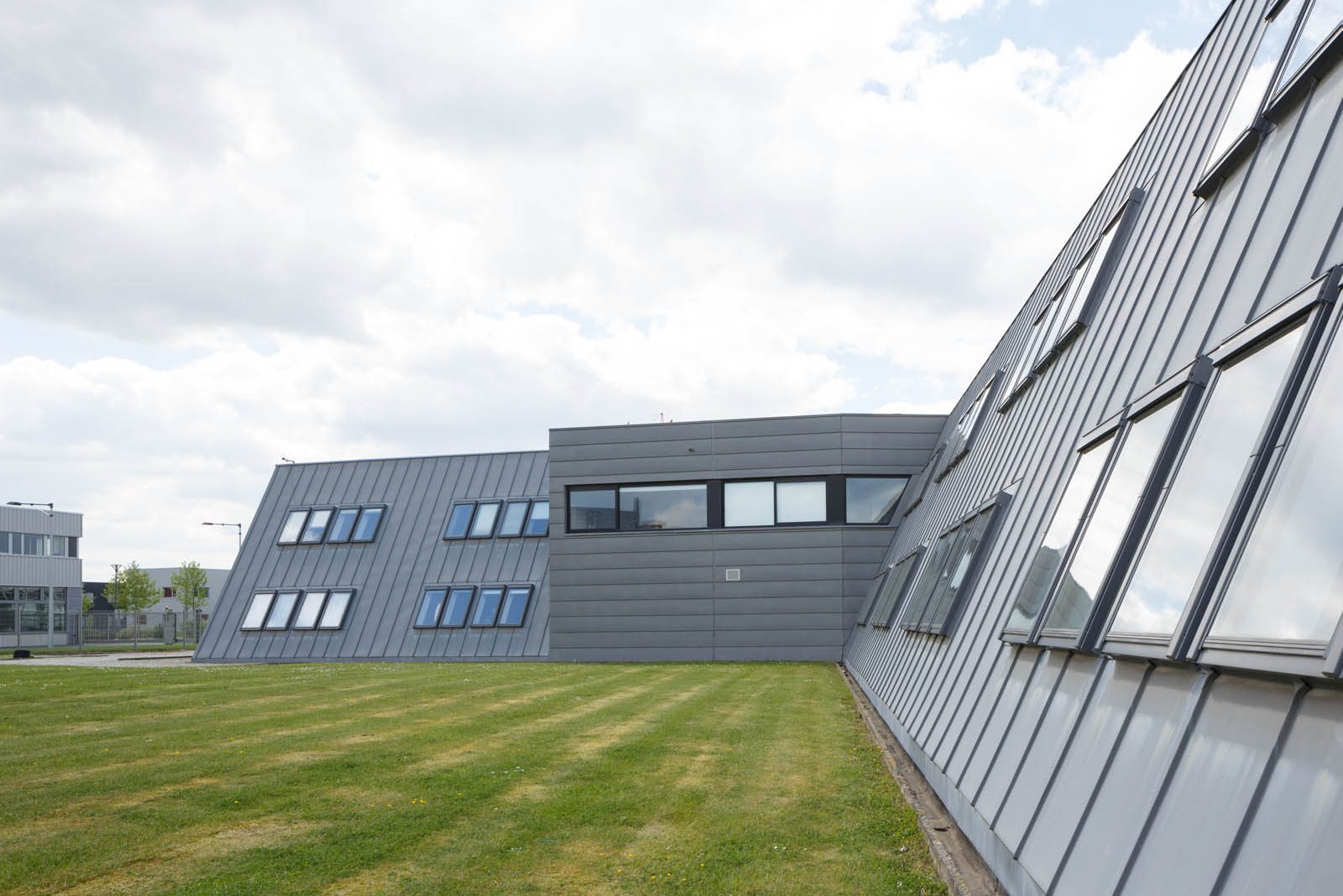 En métaphore de l’objet sculpté par son contenu technologique, une expression volontairement dynamique, s’affranchissant de l’orthogonalité, inscrit une identité forte dont le plan en V, modulé en série de duplex branchés sur une coursive par l’étage, offre autant l’autonomie de chacun que la collaboration de tous.