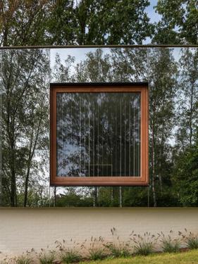 Posé sur ce soubassement, on retrouve la « boite à réflexion » qui abritera les fonctions professionnelles. Ce volume est recouvert d’une peau miroir afin de « disparaitre » dans son environnement. Grâce à la forte capacité de réflexion de ce bardage, le nouveau bâtiment se fond littéralement dans le site fortement boisé. De manière presque surréaliste, la grande baie du bureau donnera l’impression, depuis le jardin, d’une immersion dans le bureau, au travers d’une entaille dans la végétation posée sur un socle de briques. Les autres baies étant dissimulées derrière la peau translucide, elles ne sont perceptibles qu’à la nuit tombée.
