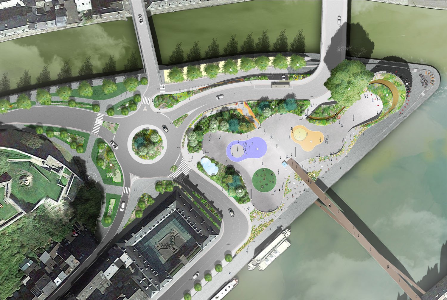 - La nouvelle esplanade est le lieu de convergence et d’articulation, entre deux milieux très distincts. D’une part, les bords de Meuse, et d’autre part le parc de la Citadelle. Les aménagements paysagers du Grognon tentent de concilier le tout, en prolongeant visuellement le « laniérage » de mur et de végétation de la citadelle jusqu’à l’eau, intégrant en son centre une large esplanade.[...]