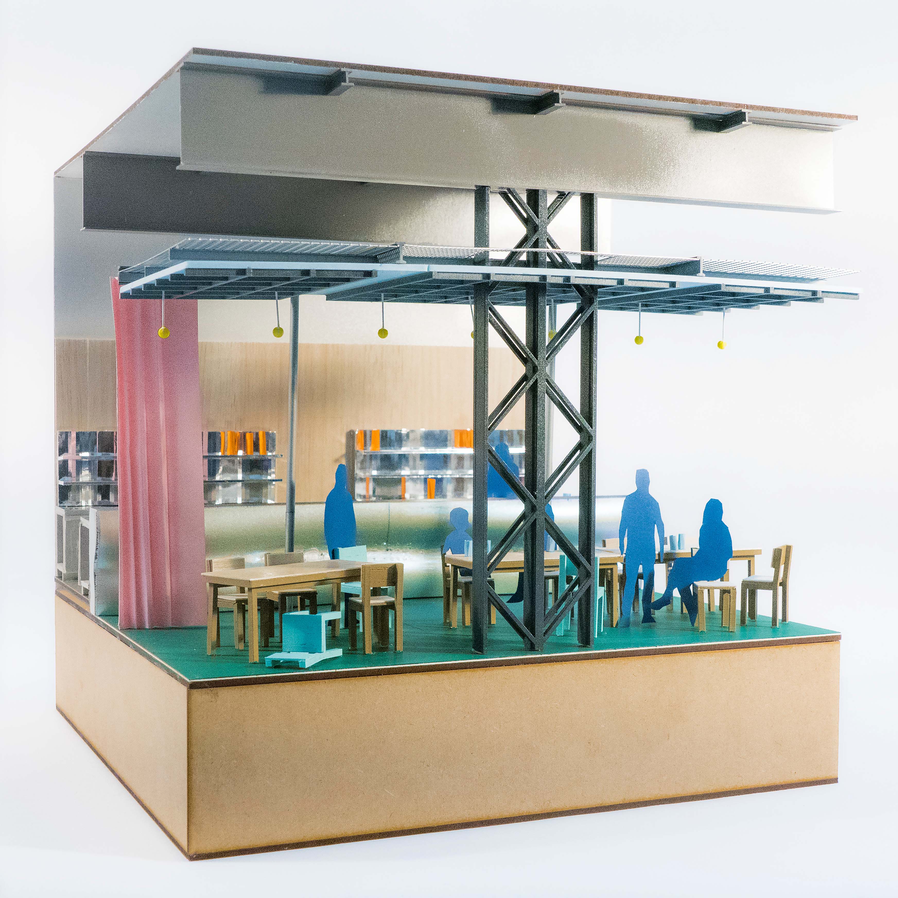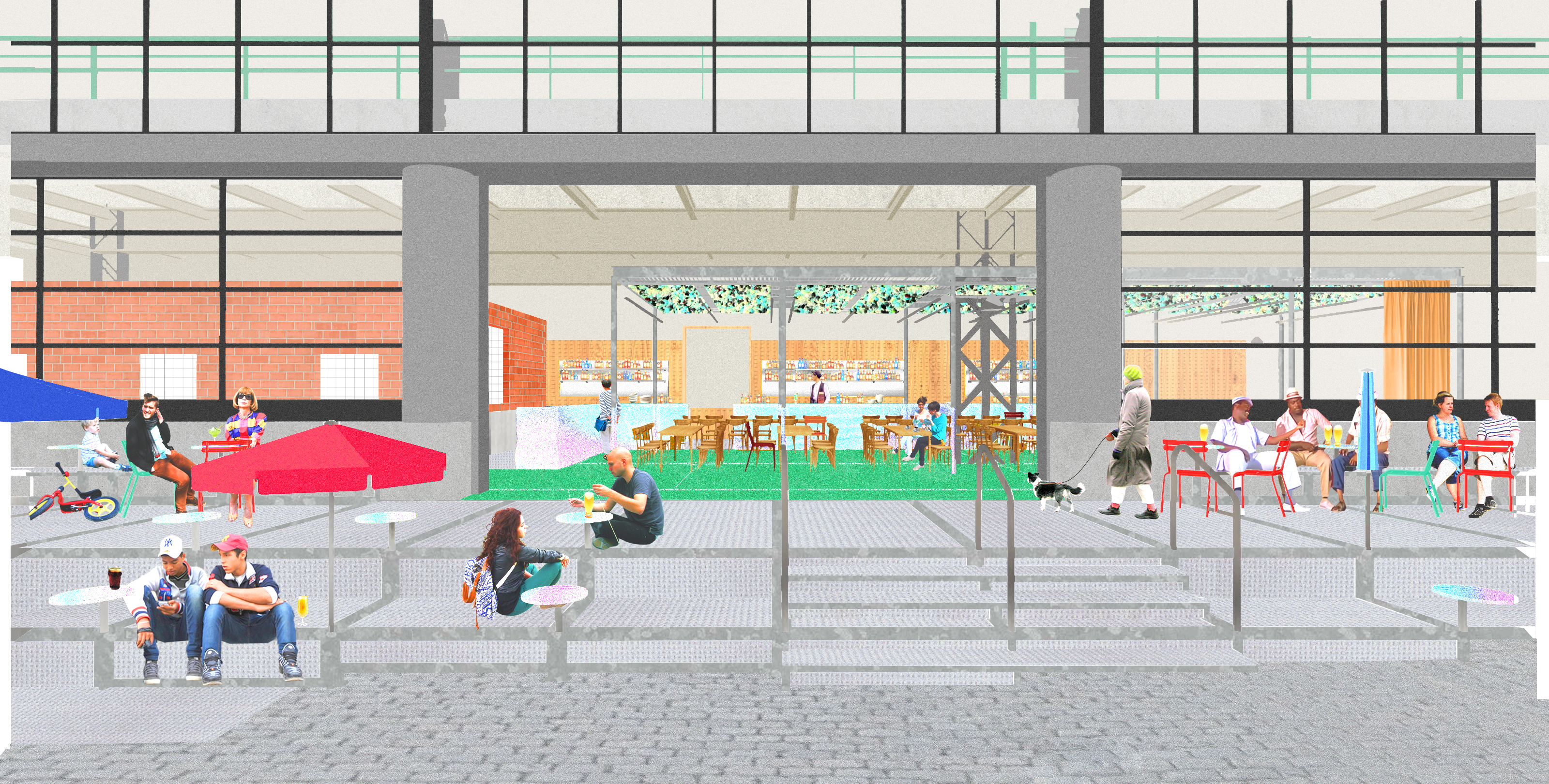 Le projet se construit à partir de grands objets publics: les gradins qui s'ouvrent sur le canal et permettent une grande disponibilité en terrasse à partir d"un objet standard; et la place couverte à l'intérieur de la salle, support technique pour multiples usages intérieurs (expo, marché, vernissage). De même, à l'intérieur du bar, le fond de bar se réfère aux brasserie bruxelloises et le bloc cuisine s'inspire des buvettes sportives.