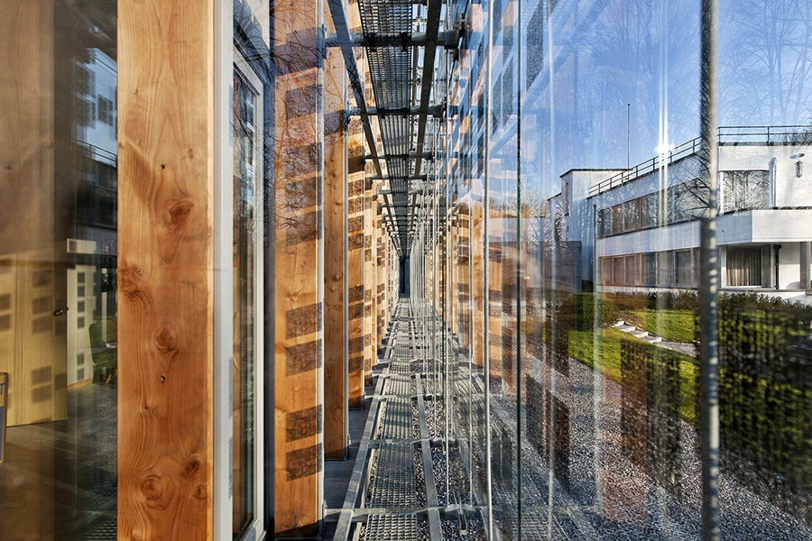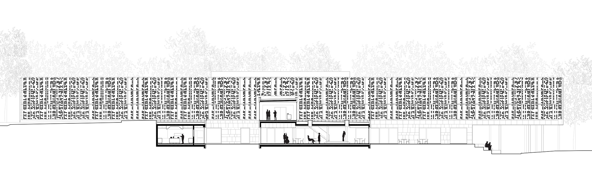 Le projet se traduit par une longue barre de près de cent mètres de long tendue à l’arrière du bâtiment construit en 1939 par Yvan Renchon. Comme une toile de fond pour ce patrimoine classé dont elle double les capacités, la nouvelle architecture joue avec le verre et la pierre pour créer un décor qui reflète la nature autant qu’il répond à l’architecture existante. La transcription d’une partition d’Eugène Ysaye en une myriade de pixels imprimés sur la peau de verre se dresse en avant-plan, donnant un effet de dématérialisation aux volumes qu’elle abrite, projetés vers la forêt d’Argenteuil.