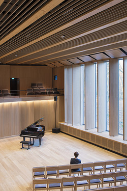 Un soin particulier est donné aux qualités acoustiques des espaces intérieurs: les sons musicaux doivent circuler, s’amplifier, résonner, être guidés, tandis que les sons perturbateurs doivent être absorbés. Le bois en plancher, en lambris, en panneaux acoustiques et parfois en plafond apparaît dans sa texture naturelle.