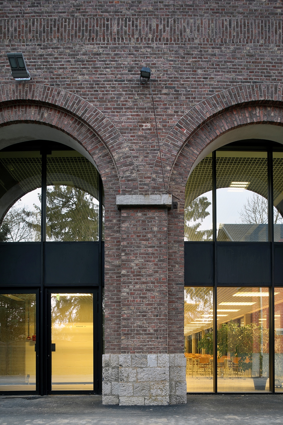 L'imposante bâtisse a été intégralement vidée de l'intérieur pour n'en laisser que les murs extérieurs et le toit. Les 16 arcs en plein-cintre – qui n'étaient pour le bâtiment existant qu'un simple modelé de façade dans des murs pleins – ont été percés de manière à ouvrir les nouveaux espaces à la lumière naturelle. Le nouveau programme s'est inséré dans cet ensemble existant à la manière d'une "boîte dans la boîte" autonome tant en structure qu'en enveloppe. Le nouveau volume est habillé d'un mur-rideau en aluminium anodisé noir légèrement en retrait des murs existants. Il emprunte les codes de la tour de bureaux modernistes pour nourrir la confrontation avec l'architecture traditionnelle qui l'abrite.