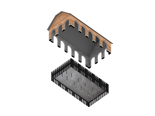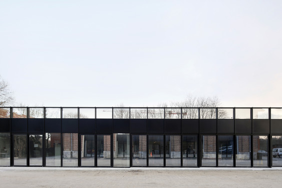 Face à la grange, un nouveau volume bas est créé pour abriter garages et ateliers. Adosser aux terrains de beach volley, sa toiture en forme les gradins. Sa longue façade répond au volume construit dans la grange par l'adoption du même mur-rideau. La nouvelle rue intérieure ainsi créée organise un jeu de réflexion infinies e