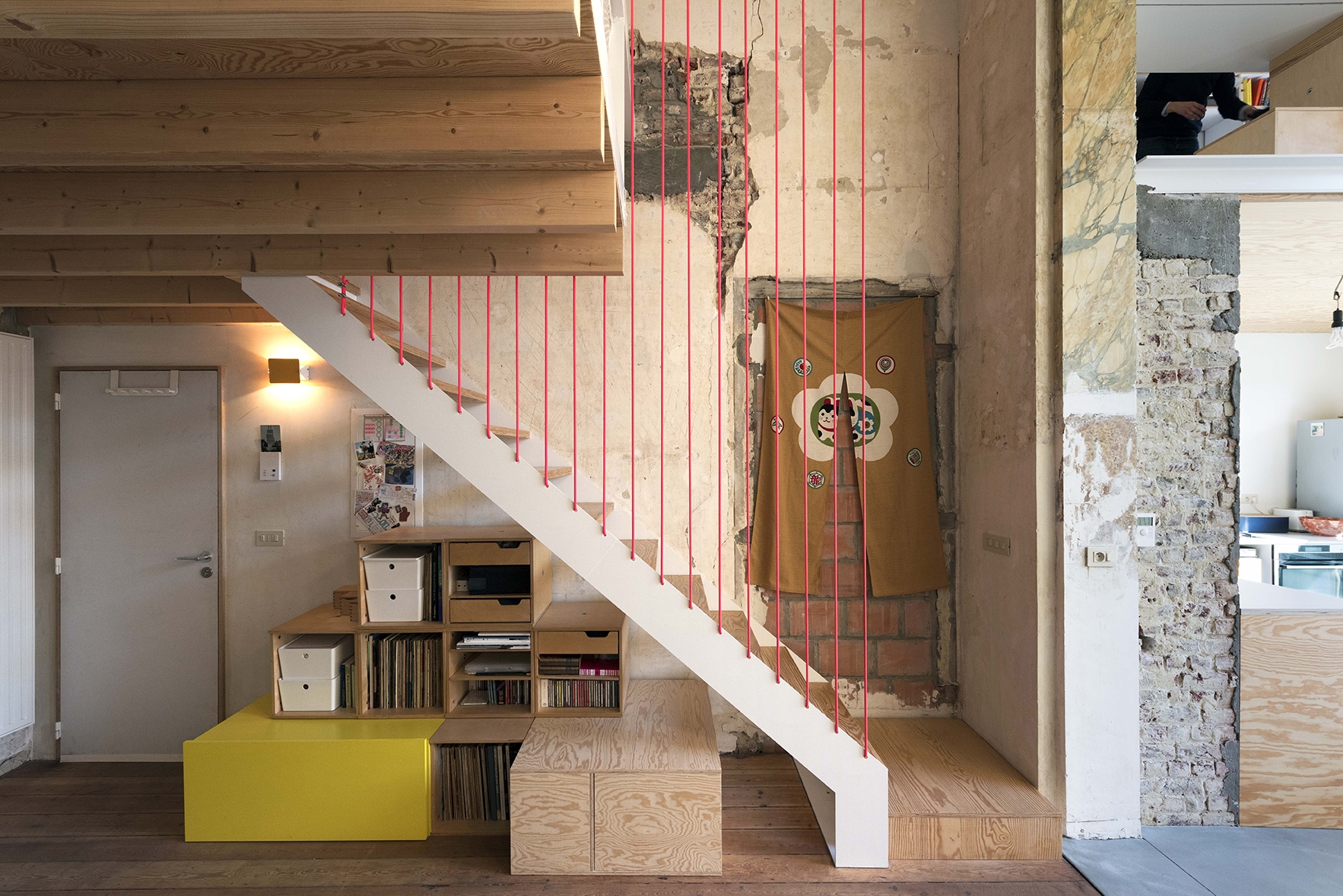 Les portes coulissantes, pivotantes, des lucarnes en forme d'hexagone, des planchers suspendus ou des cordes d'escalade qui forment des garde-corps colorés, …, participent à une atmosphère débordante.