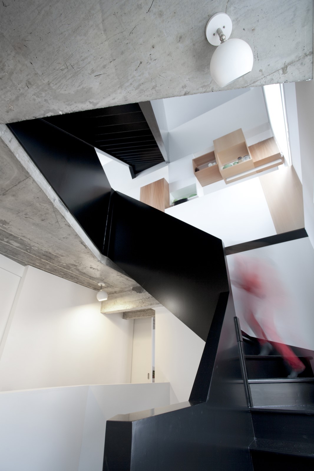 Le duplex se développe sur deux grands plateaux de 125 m². L'étage supérieur, par lequel on accède à l'appartement contient les pièces de vie. L'escalier métallique existant a été conservé et donne accès à la terrasse en toiture via une large coupole vitrée. L'espace en forme de trapèze a été cloisonné le moins possible, les pièces se succèdent séparées tantôt par une bibliothèque, tantôt par une portion de mur. A l'étage inférieur le couloir des chambres est animé par des prises de lumière et par des décrochement créant ainsi des poches spatiales, aires de jeux ou de rangements.
