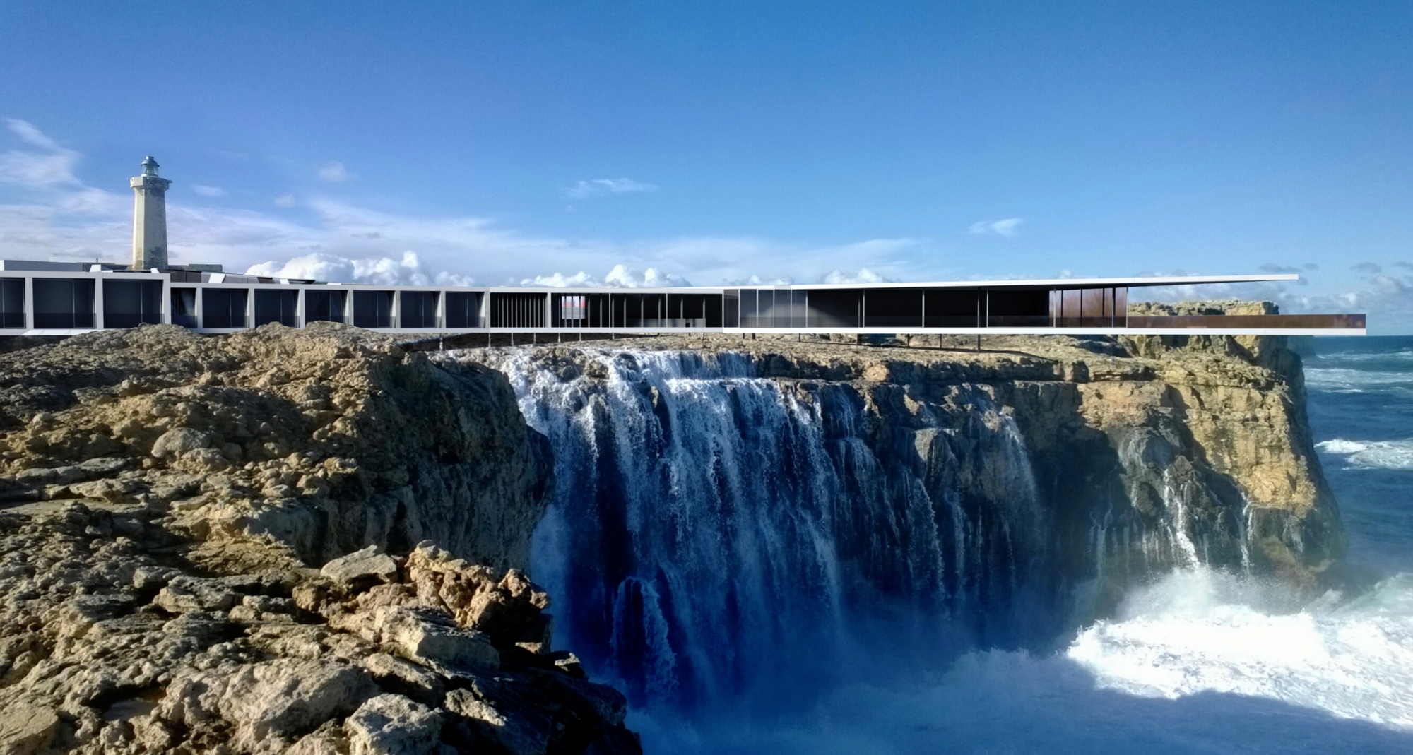 Le Lighthouse sea Hotel proposé par l'équipe de Luc Spits Architecture profite de ce rocher abrupte pour s'insinuer de manière anguleuse à ras du sol jusqu'à s'élancer vers la mer.
