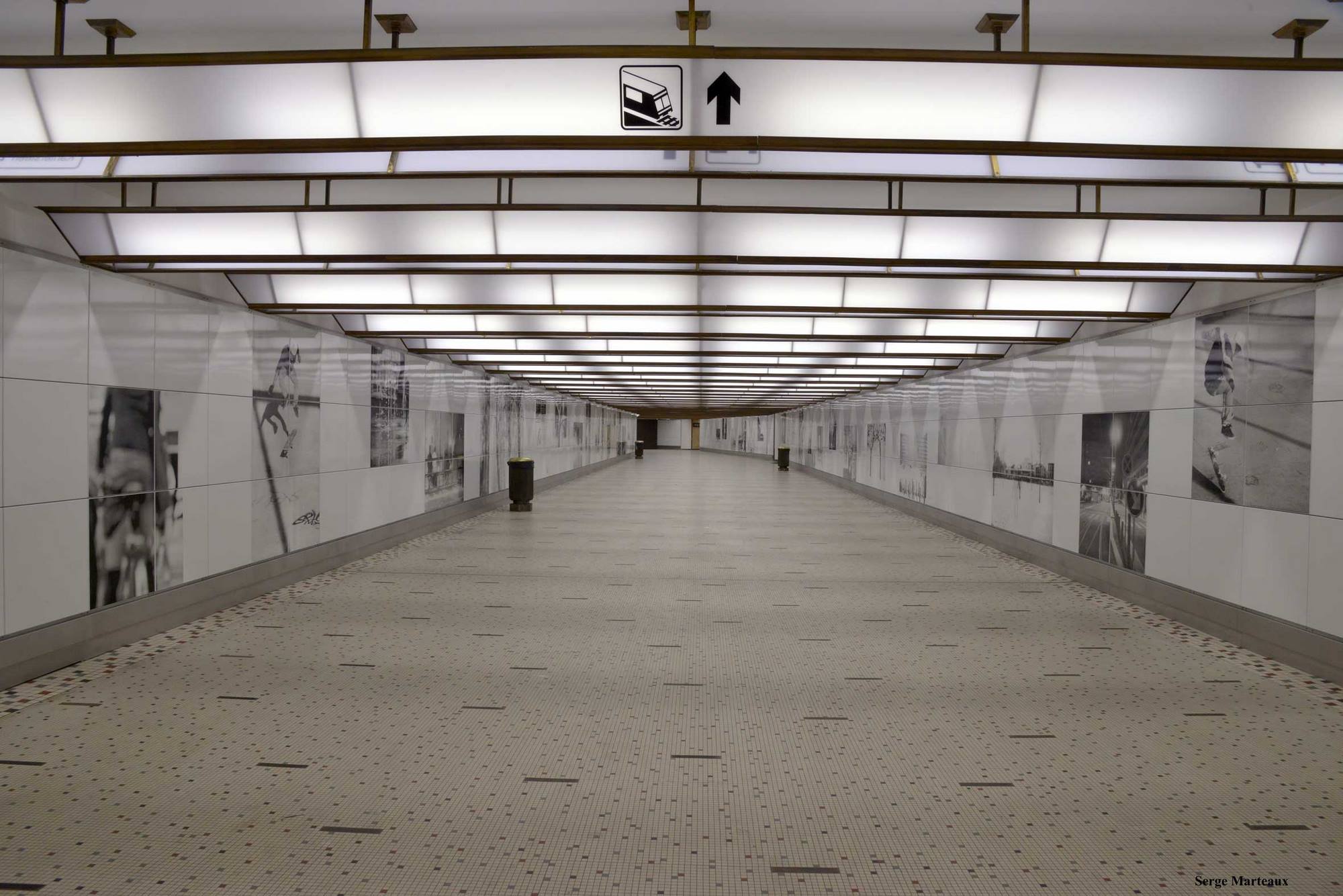 - A l'issue d'un concours organisé par Beliris en 2008, l’atelier Ma2 se voit chargé de la restructuration du couloir reliant la gare au métro. S’en suit alors un consciencieux travail de restauration, que méritaient amplement les éléments de décoration. Le couloir de la gare a regagné en intensité lumineuse grâce à une réhabilitation des luminaires et à une restauration du sol. Une collaboration avec l’artiste Daniel Deltour et Bernard Baines a permit l’élaboration des parois périphériques.[...]